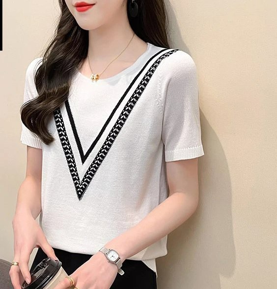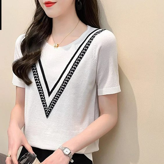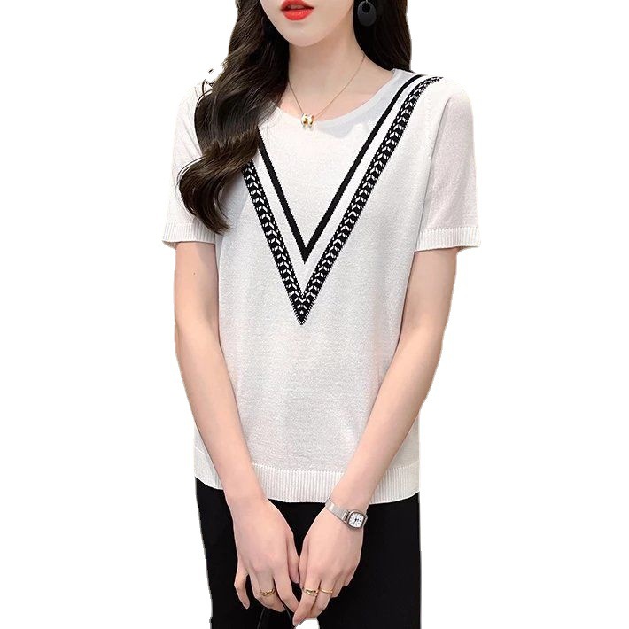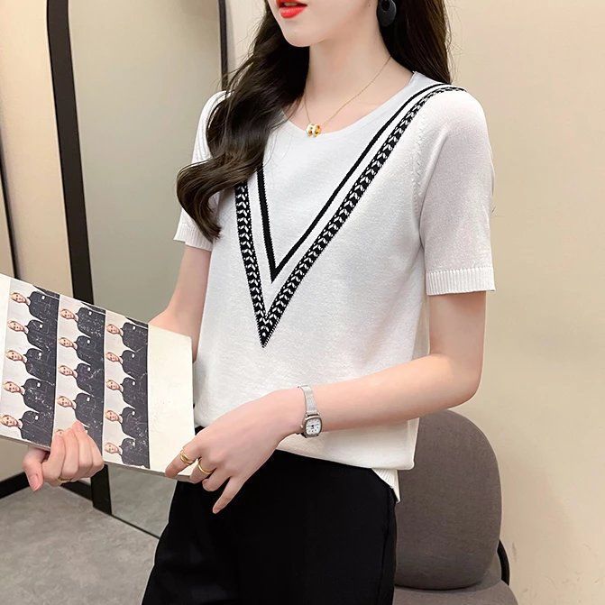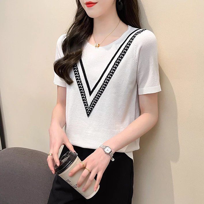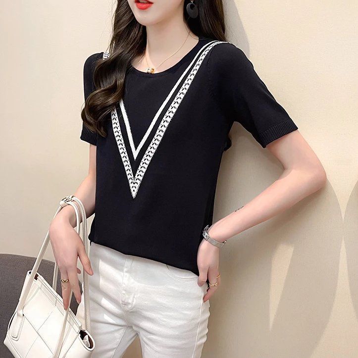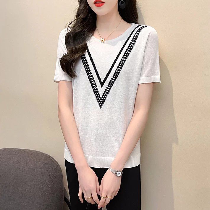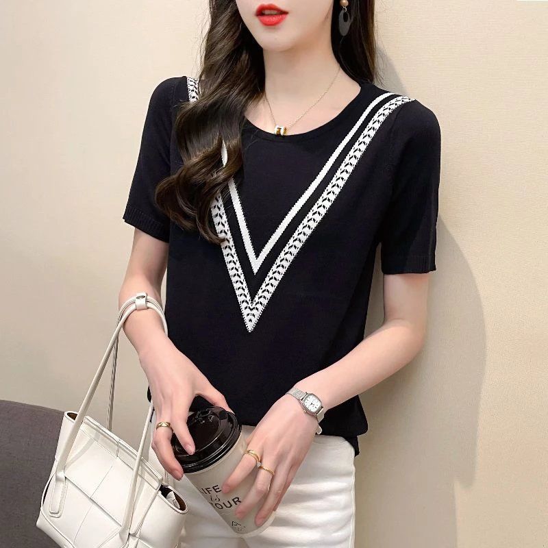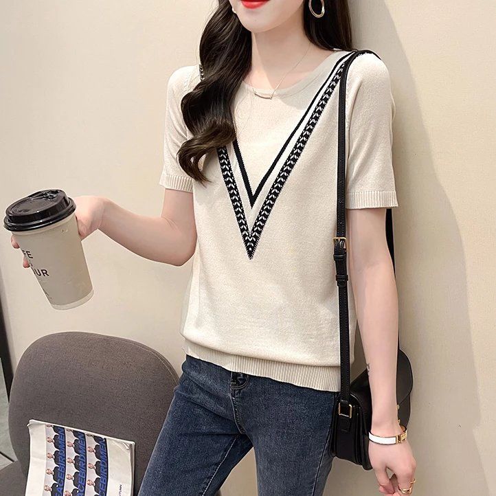 Новинка 2025 года, летняя трикотажная женская рубашка с короткими рукавами, пуловер с круглым вырезом, свитер, облегающий топ в корейском стиле