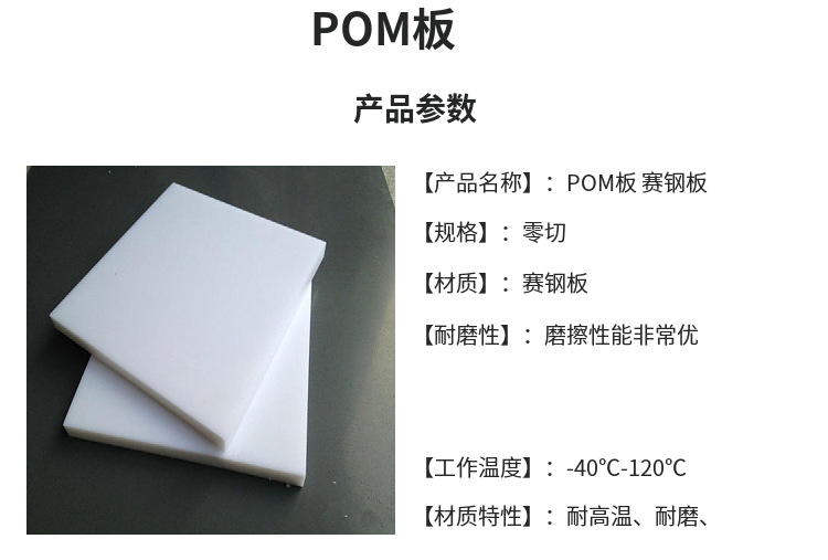 pom板(聚甲醛板)英文名称Polyoxymethylene热塑性结晶聚合物被誉为“超钢”或者“赛钢”,又称聚氧亚甲基。英文缩写为POM,白色可燃结晶粉末,具有甲醛气味。缓慢溶于冷水,在热水中溶解较快。20℃时水中溶解度0.24g/100cm3H2O。不溶于乙醇、乙醚。溶于苛性钠、钾溶液