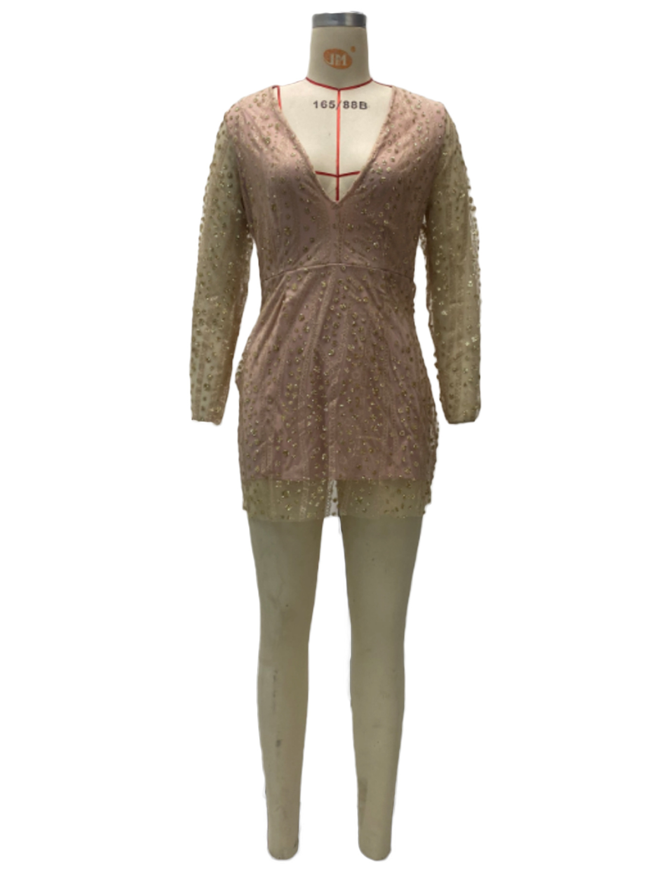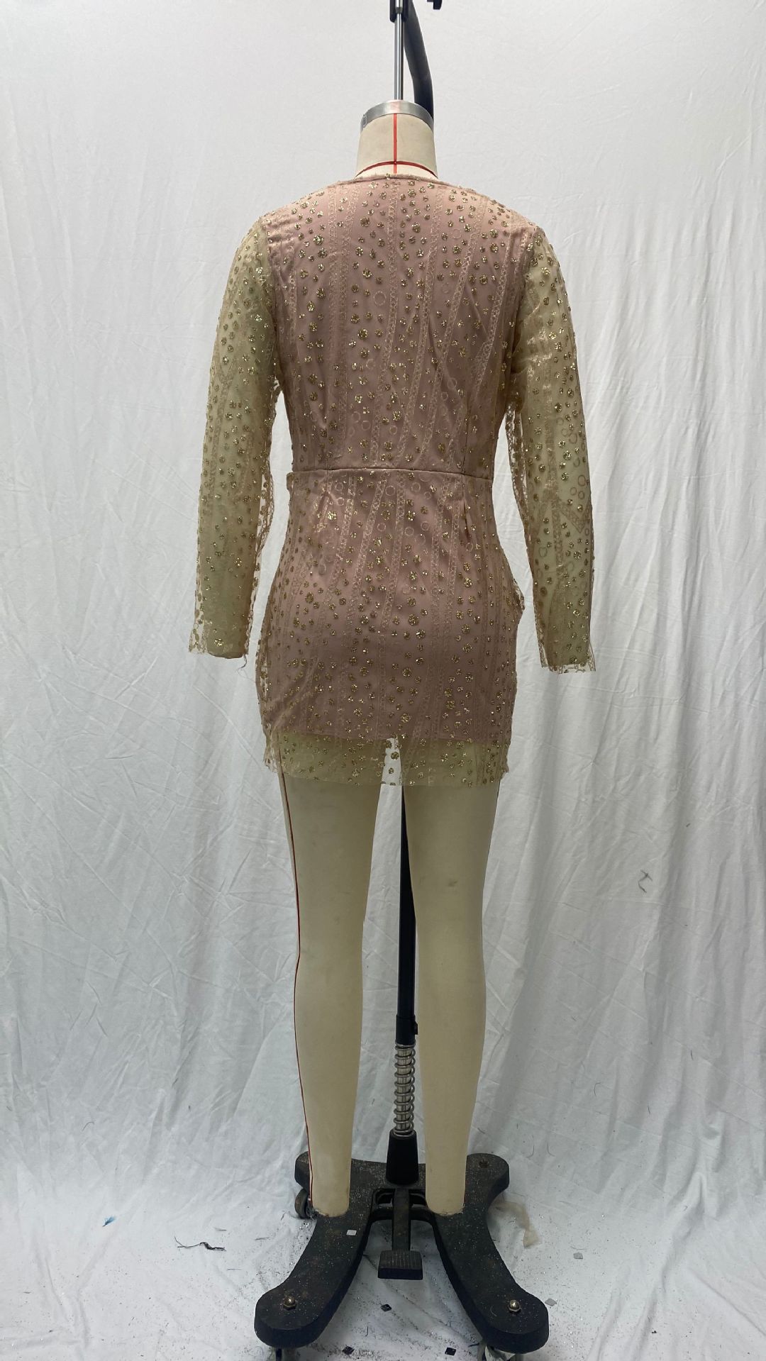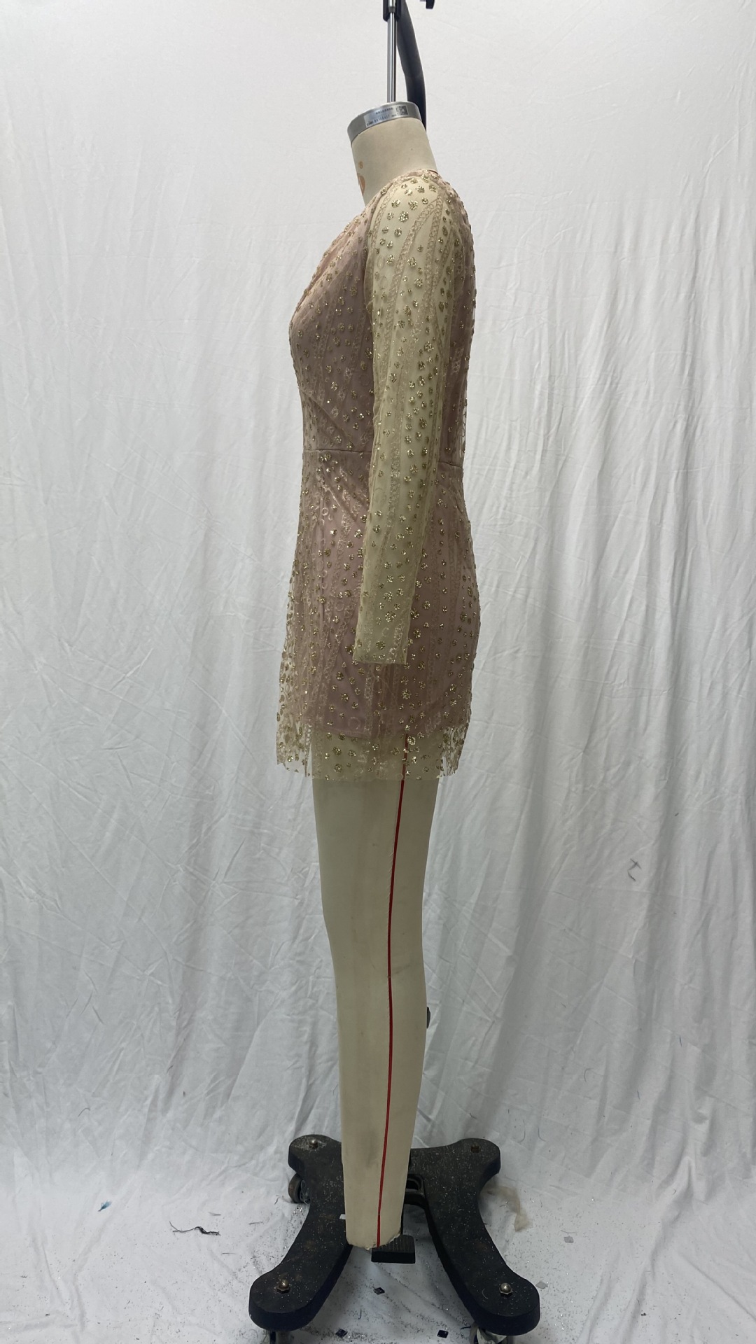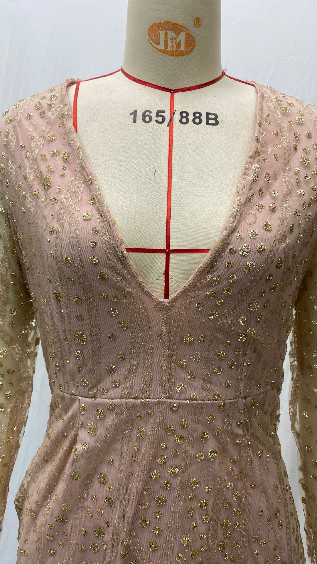 Новое платье 2025 года для женщин, вдохновленное европейским и американским дизайном, с глубоким V-образным вырезом, прозрачными длинными рукавами и золотистыми декоративными элементами, продается на eBay.