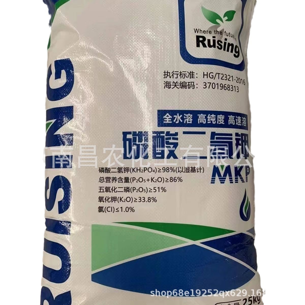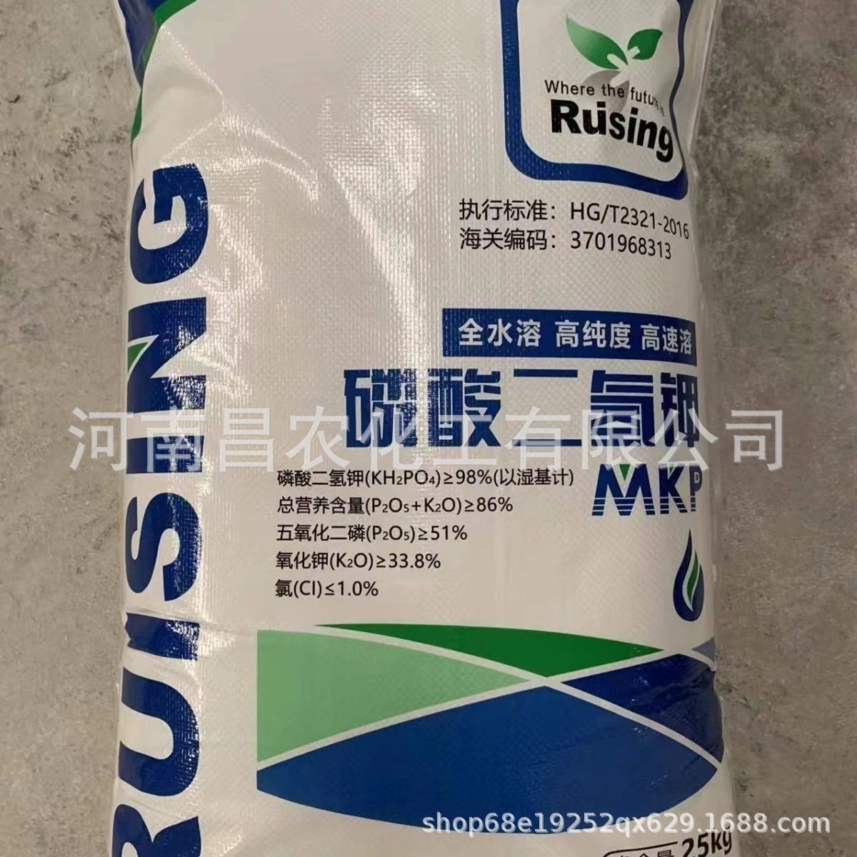 农业上用作高效磷钾复合肥;磷酸二氢钾产品广泛适用于各类型经济作物、粮食、瓜果、蔬菜等几乎全部类型的作物,各省均由当地的农科院所、土肥站等专家机构针对磷酸二氢钾适用于各类典型作物进行了很多的相关应用实验,通过各地对各类型作物的实际施用效果证明磷酸二氢钾具有显著增产增收、改量优化品质、抗倒伏、抗病虫害、防治早衰等许多优良作用,并且具有克服作物生长后期根系老化吸收能力下降而导致的营养不足的作用。磷酸二氢钾属新型高浓度磷钾二元素复合肥料,其中含五氧化二磷52%左右,含氧化二钾34%左右。烤烟需磷、钾量大,特别是需钾量大。磷酸二氢钾是用于烤烟的一种较为理想的新型肥料。为了探索磷酸二氢钾在烤烟上的使用价值和施用方法,以提高烟叶品质。磷酸二氢钾用在棉花上能够控制棉花徒长,增加植株花苞数量。磷酸二氢钾广泛运用于滴管喷灌系统中。