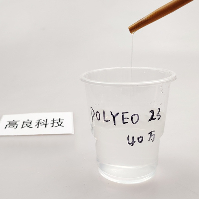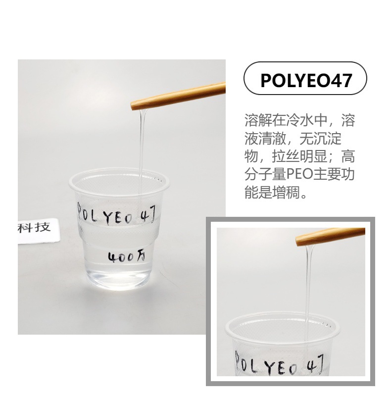 PEO200万、PEO300万、PEO400万溶解在冷水中。水溶液清澈透亮,无沉淀物,拉丝效果明显!高分子量PEO主要功能是增稠。