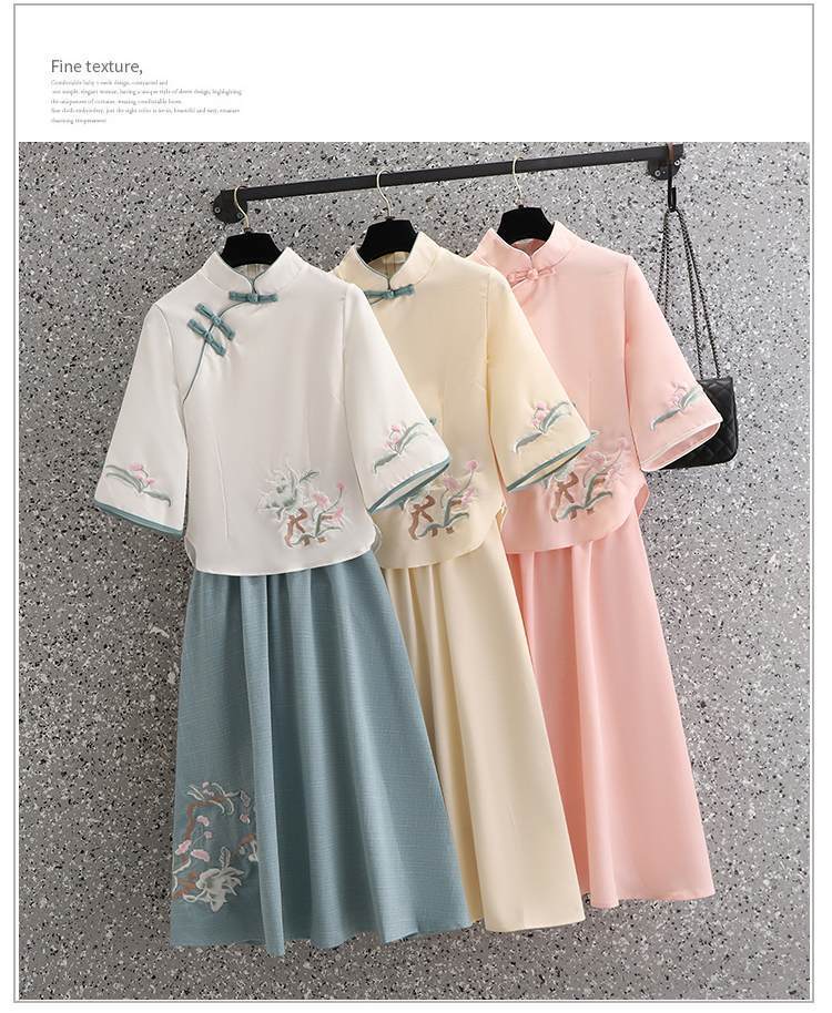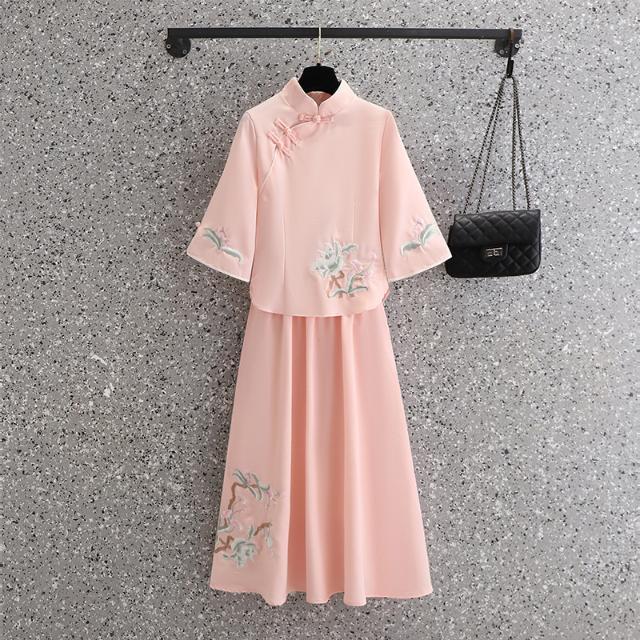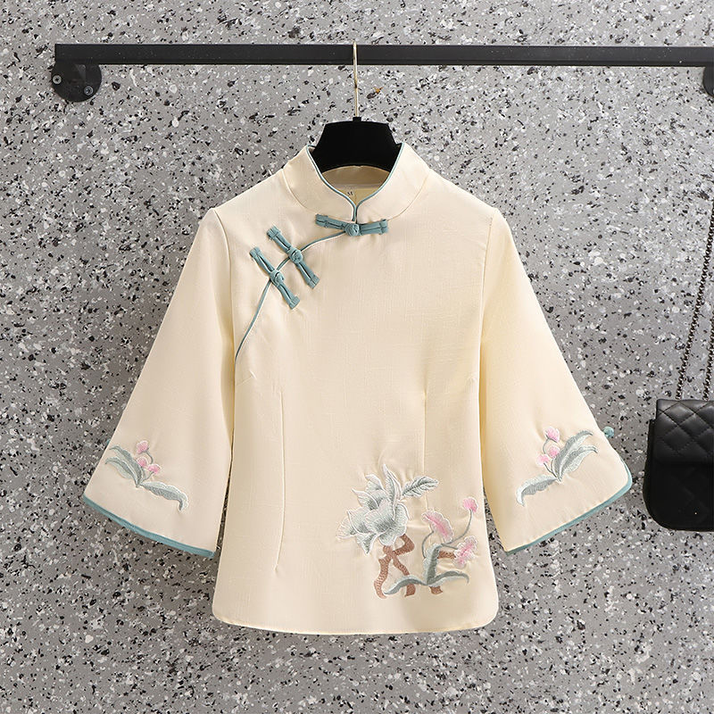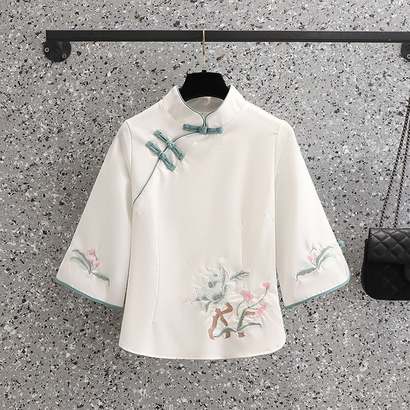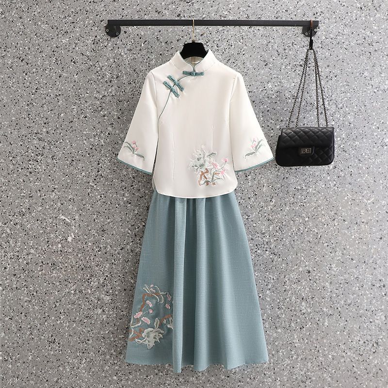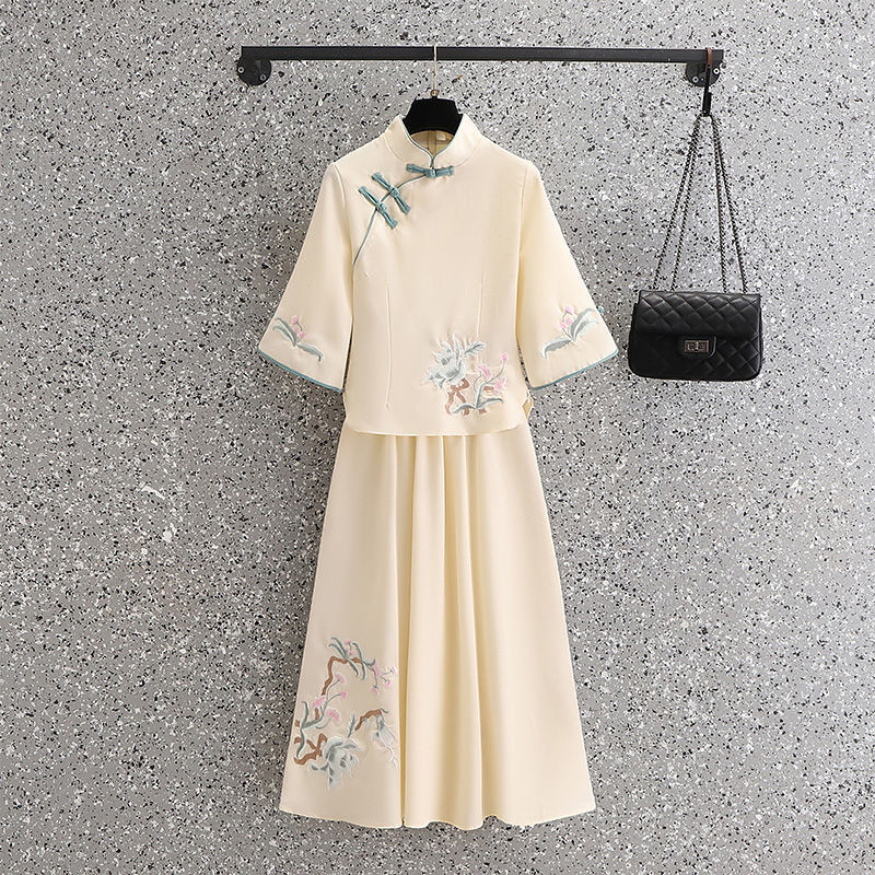 Высококачественный китайский костюм для чаепития, улучшенная версия, рукава три четверти, вышитый магнолией комплект из двух предметов, элегантный новый китайский чонсам.