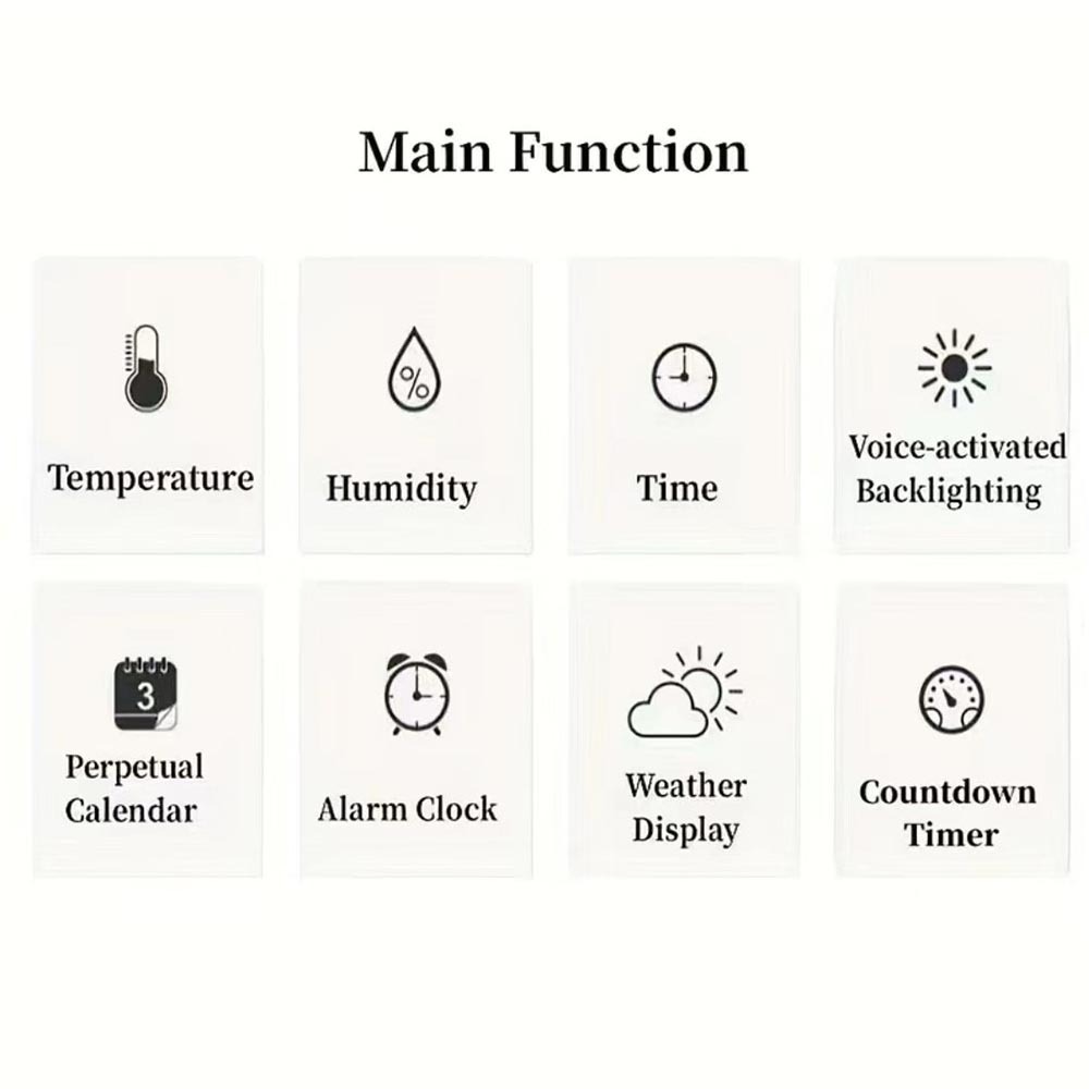 Термометр; Светящийся свет; Прогноз погоды; Вечный календарь; Сигнальный звонок; Хронограф; Обратный отсчет; 24 часа инструкции; Измерение влажности; Отображение недели; Отображение месяца