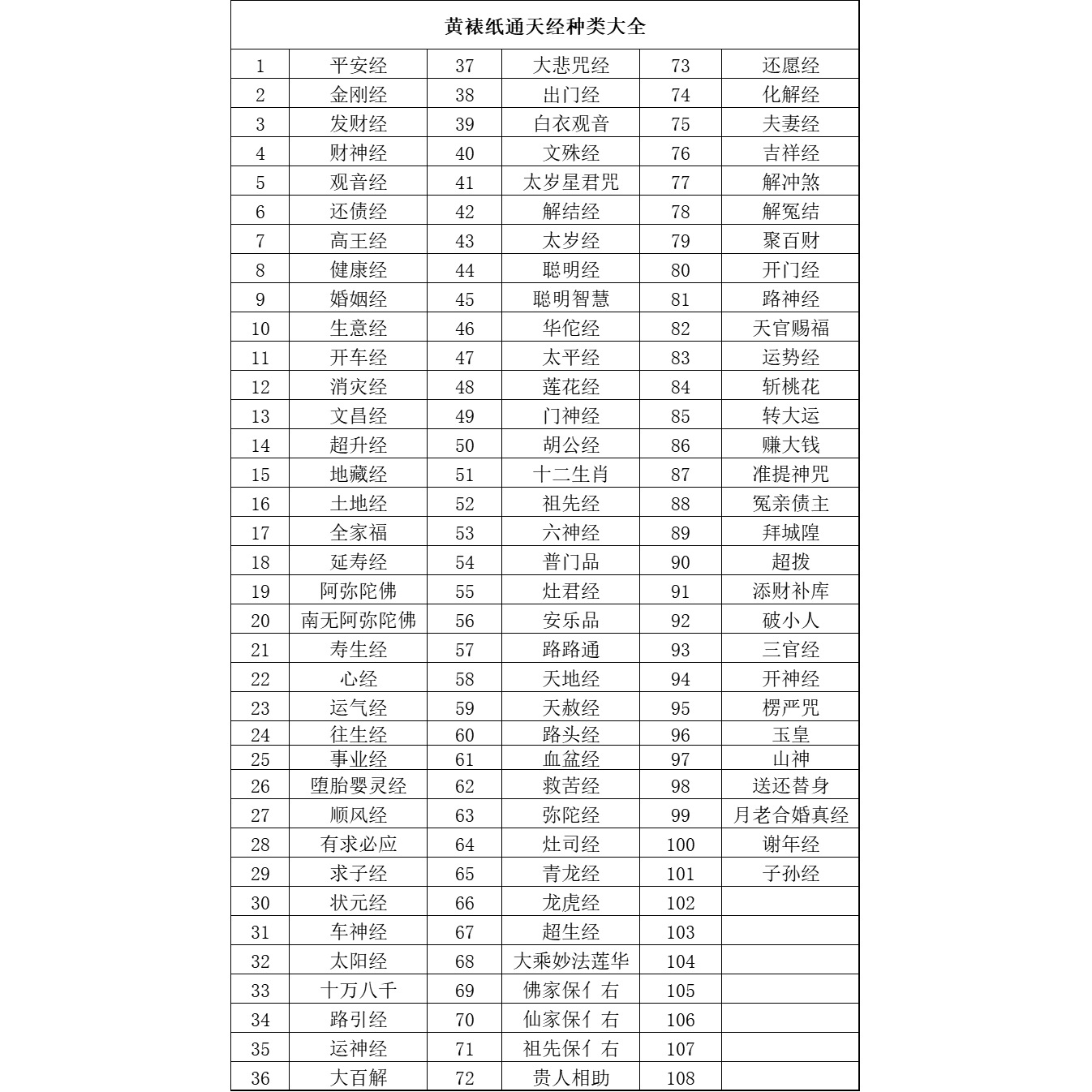 Каталог Священных Писаний; №1 Пин Ан (1 упаковка по 10 шт.); №2 Кинг-Конг (1 упаковка по 10 шт.); №4 Цай Шен (1 упаковка по 10 шт.); №3 Фа Цай (1 упаковка по 10 шт.); №5 Гуаньинь (1 упаковка по 10 шт.); №6 тоже заи (1 упаковка по 10 шт.); №7 Гао Ван (1 упаковка по 10 шт.); №8 Здоровье (1 упаковка по 10 шт.); Брак №9 (1 упаковка по 10 шт.); Бизнес №10 (1 упаковка 10 шт.); Поездка 11 числа (1 упаковка по 10 шт.); №12 Водная катастрофа (1 упаковка по 10 шт.); № 13 Вэньчан (1 упаковка по 10 шт.); №14 Чжуцзяо Шэн (1 упаковка по 10 шт.); №15 Кситигарбха (1 упаковка по 10 шт.); Участок №16 (1 упаковка по 10 шт.); Семейный портрет №17 (1 упаковка по 10 шт.); № 18 Яньшоу (1 упаковка по 10 шт.); №19 Амитабха фор (1 упаковка 10 шт.); 20 Намо Амитабха; №20 Шоушенг (1 упаковка по 10 шт.); №21 Сутра Сердца (1 упаковка по 10 шт.); № 22 Удача (1 упаковка по 10 шт.); Реинкарнация №23 (1 упаковка по 10 шт.); Карьера №24 (1 упаковка по 10 шт.); № 25 Дух абортного ребенка (1 упаковка по 10 шт.); №26 Шуньфэн (1 упаковка по 10 шт.); № 27 Youqiu Biying (1 упаковка по 10 шт.); №28 Цюй Цзы (1 упаковка по 10 шт.); № 29 Чемпион (1 упаковка по 10 шт.); №30 Чэ Шэнь (1 упаковка 10 шт.); № 31 Мантра «Большое сострадание» (1 упаковка из 10 шт.); Выходите 32-го (1 упаковка по 10 шт.); №33 Белый Гуаньинь (1 упаковка по 10 шт.); №34 Манжусри (1 упаковка по 10 шт.); №35 Тай Суй Синь Цзюнь (1 упаковка по 10 шт.); Узел №36 (1 упаковка по 10 шт.); №37 Тай Суй (1 упаковка по 10 шт.); № 38 Смарт (1 упаковка по 10 шт.); № 89 «Умная мудрость» (1 упаковка по 10 шт.); №39 Хуатуо (1 упаковка по 10 шт.); №40 Тайпин (1 упаковка 10 шт.); №41 Лотос (1 упаковка по 10 шт.); №42 Менсин (1 упаковка 10 шт.); №43 Ху Гун (1 упаковка по 10 шт.); Знак Зодиака №44 (1 упаковка по 10 шт.); Предок №45 (1 упаковка по 10 шт.); № 46 Шесть Сутры Шен (1 упаковка по 10 штук); №47 Пумон (1 упаковка 10 шт.); №48 Заоцзюнь (1 упаковка по 10 шт.); №49 Анлепин (1 упаковка 10 шт.); Пассапарут №50 (1 упаковка 10 шт.); №51 Тианди (1 упаковка по 10 шт.); № 52 Амнистия (1 упаковка по 10 шт.); №53 Луту Цзин (1 упаковка по 10 шт.); Чаша для крови №54 (1 упаковка по 10 шт.); №55 Джиу Ку (1 упаковка 10 шт.); № 56 Амитабха (1 упаковка по 10 шт.); №57 Заоси (1 упаковка 10 шт.); № 58 Цинлонг (1 упаковка из 10 шт.); № 59 Дракон-Тигр (1 упаковка по 10 шт.); № 60 студентов, путешествующих (1 упаковка по 10 шт.); № 61 Солнце (1 упаковка по 10 шт.); № 62 Сто тысяч восемь тысяч (1 упаковка по 10 штук); №63 Дорожное руководство (1 упаковка по 10 шт.); № 64 Суйюнь Шэнцзин (1 упаковка по 10 шт.); №65 Дабайжи (1 упаковка 10 шт.); № 66 Махаяна Лотосовая Сутра (1 упаковка по 10 штук); №67 Буддийское право на защиту (1 упаковка по 10 шт.); № 68 Сяньцзя Баоюй (1 упаковка по 10 шт.); 69 Благословение предков; № 70 Noble Help (1 упаковка по 10 шт.); № 71 Сутра возвращения обета (1 упаковка из 10 штук); Разрешение 72 (1 упаковка из 10 штук); №73 Сутра пары (1 упаковка по 10 штук); № 74 «Сутра удачи» (1 упаковка по 10 шт.); № 75 Цзэ Чон Ша (1 упаковка по 10 шт.); № 76. Устранение недовольства (1 упаковка по 10 шт.); №77 Джубай Бэйцай (1 упаковка по 10 шт.); № 78 Сутра открытия дверей (1 упаковка из 10 штук); № 79 Лу Шэнь Цзин (1 упаковка по 10 шт.); № 80 Небесное официальное благословение (1 упаковка из 10 шт.); № 81 Суйюнь Шицзин (1 упаковка по 10 шт.); №82 Нарезка персикового цвета (1 упаковка по 10 шт.); №83 Дашюнь (1 упаковка по 10 шт.); № 84 «Заработай большую сумму» (1 упаковка из 10 штук); № 85 Чжунти Шеншен Мантра (1 упаковка по 10 шт.); № 86 Заемщик неправомерных родственников (1 упаковка по 10 шт.); № 87 «Поклонение Чэнхуану» (1 упаковка по 10 штук); Суперциферблат № 88 (1 упаковка по 10 шт.); №90 «Дополнение богатства и пополнение казначейства» (1 