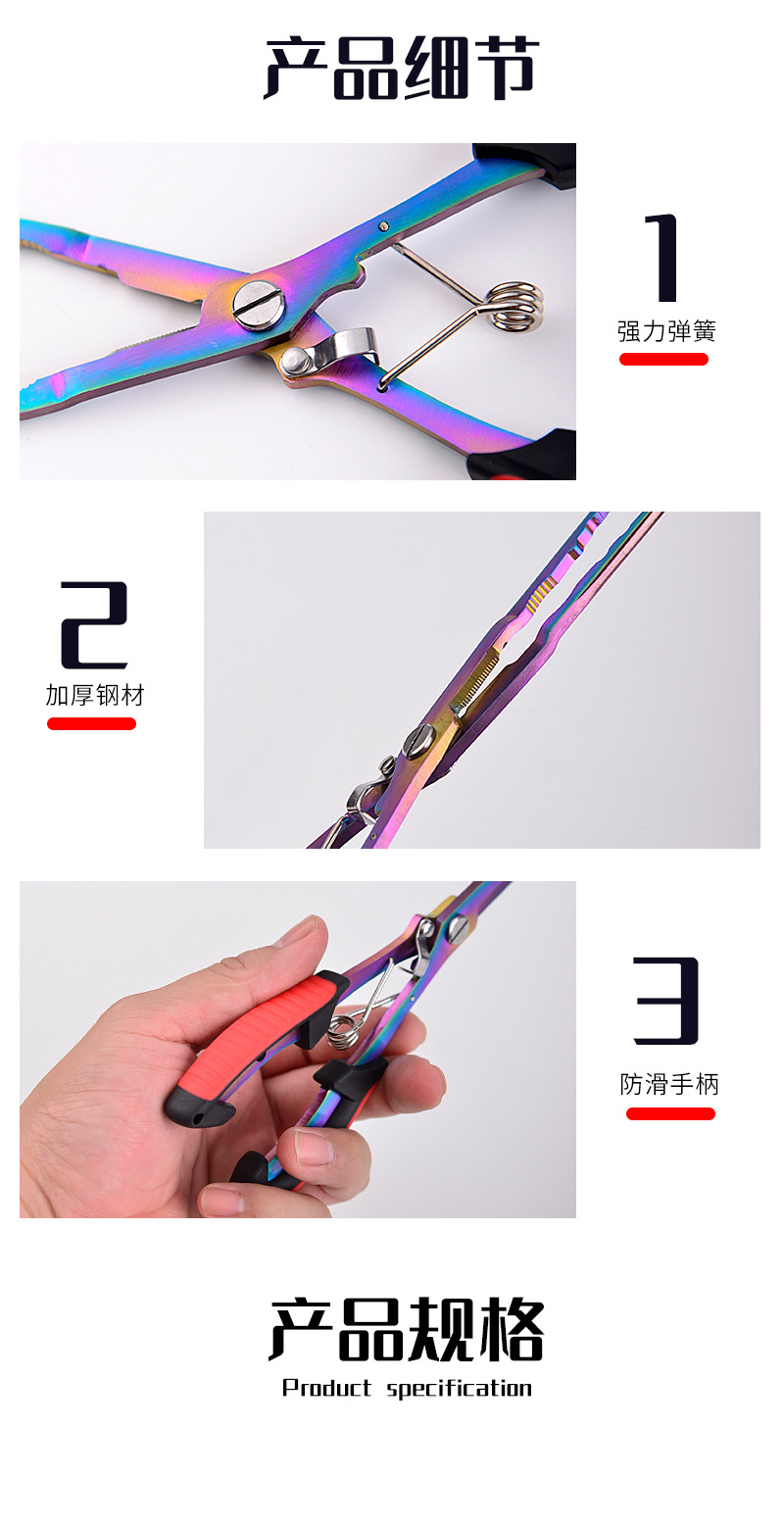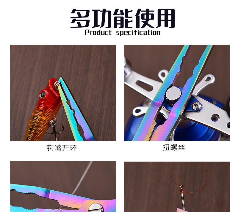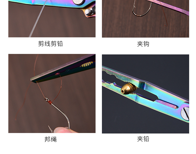产品用途:取钩、控鱼、鱼剪、断钢丝、压咬铅、夹线。