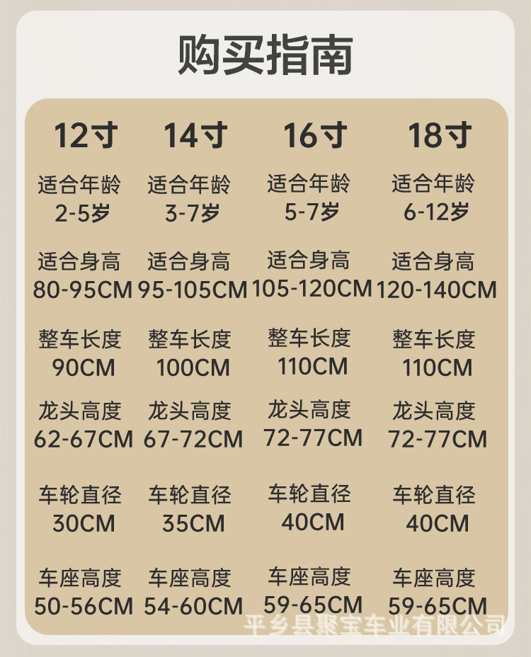 12 дюймов подходит для роста [80-90 см]; 14 дюймов подходит для роста [90-105 см]; 16-дюймовый подходит для роста [100-120 см]; 18 дюймов подходит для роста [110-130 см]; 20 дюймов подходит для роста [120-140 см]