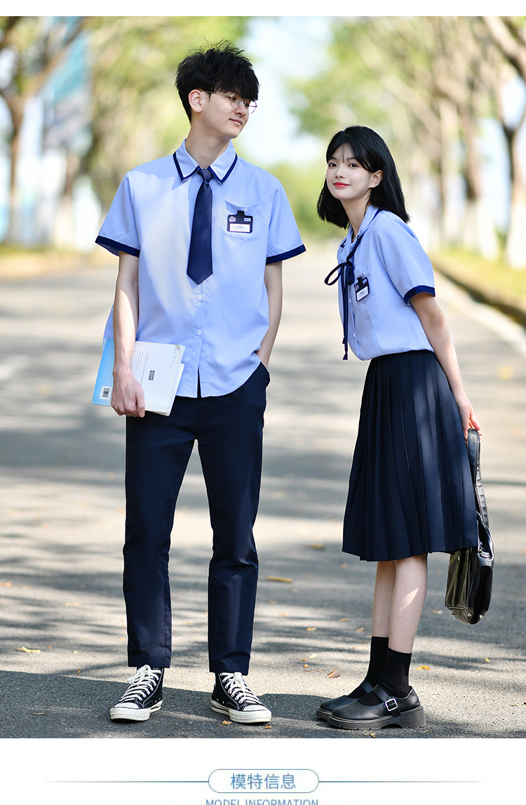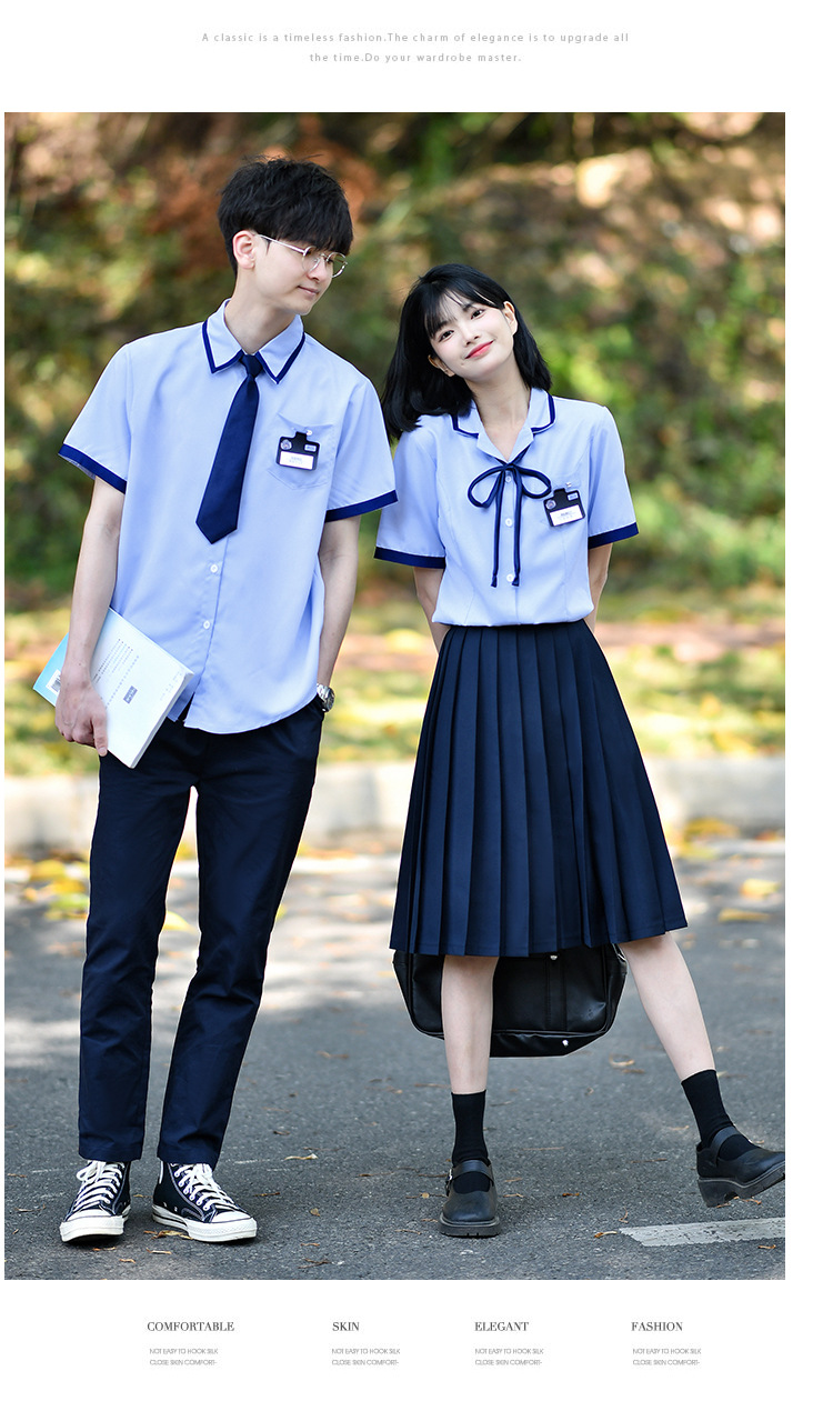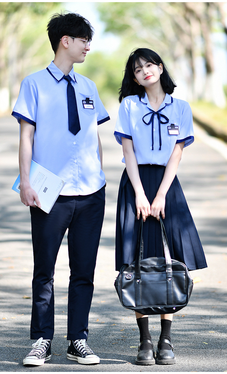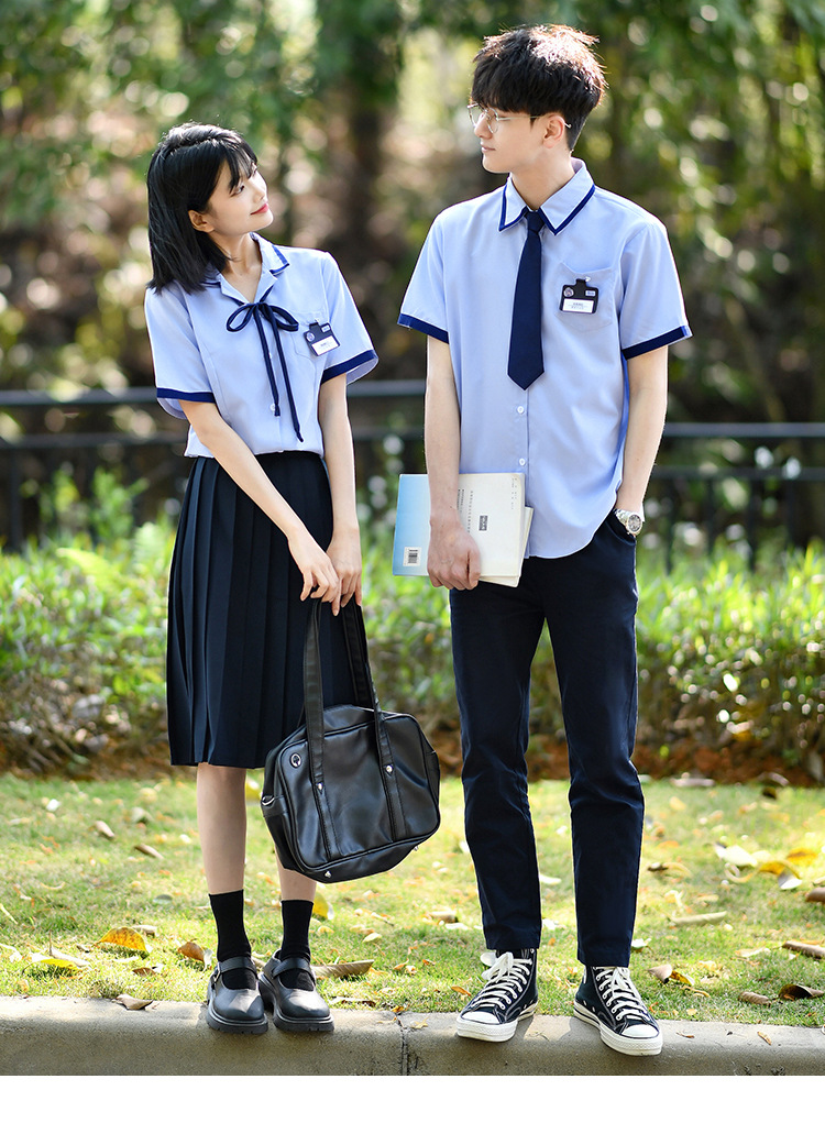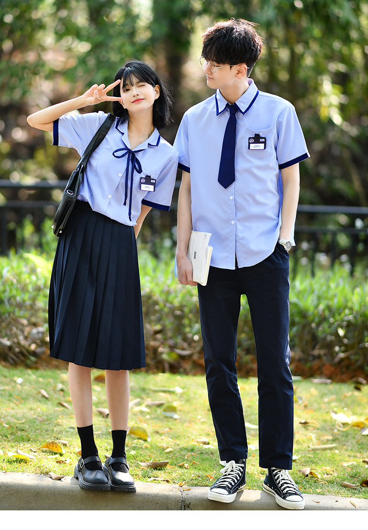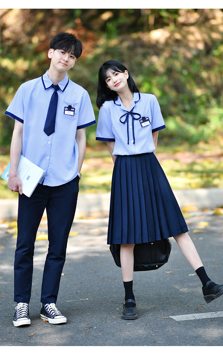 Значок галстука рубашки для мальчиков; Значок воротник рубашки для девочек; Синие брюки; Синяя плиссированная юбка