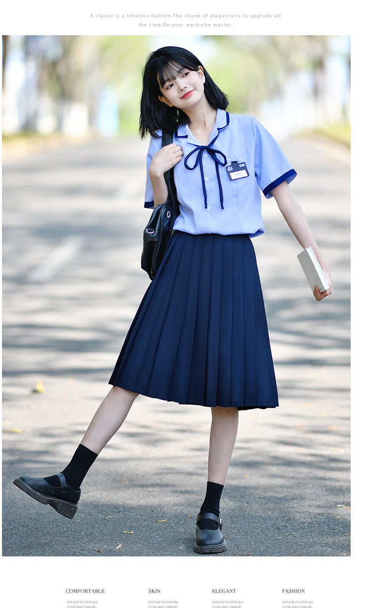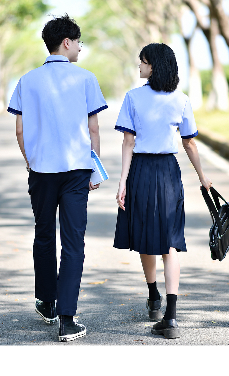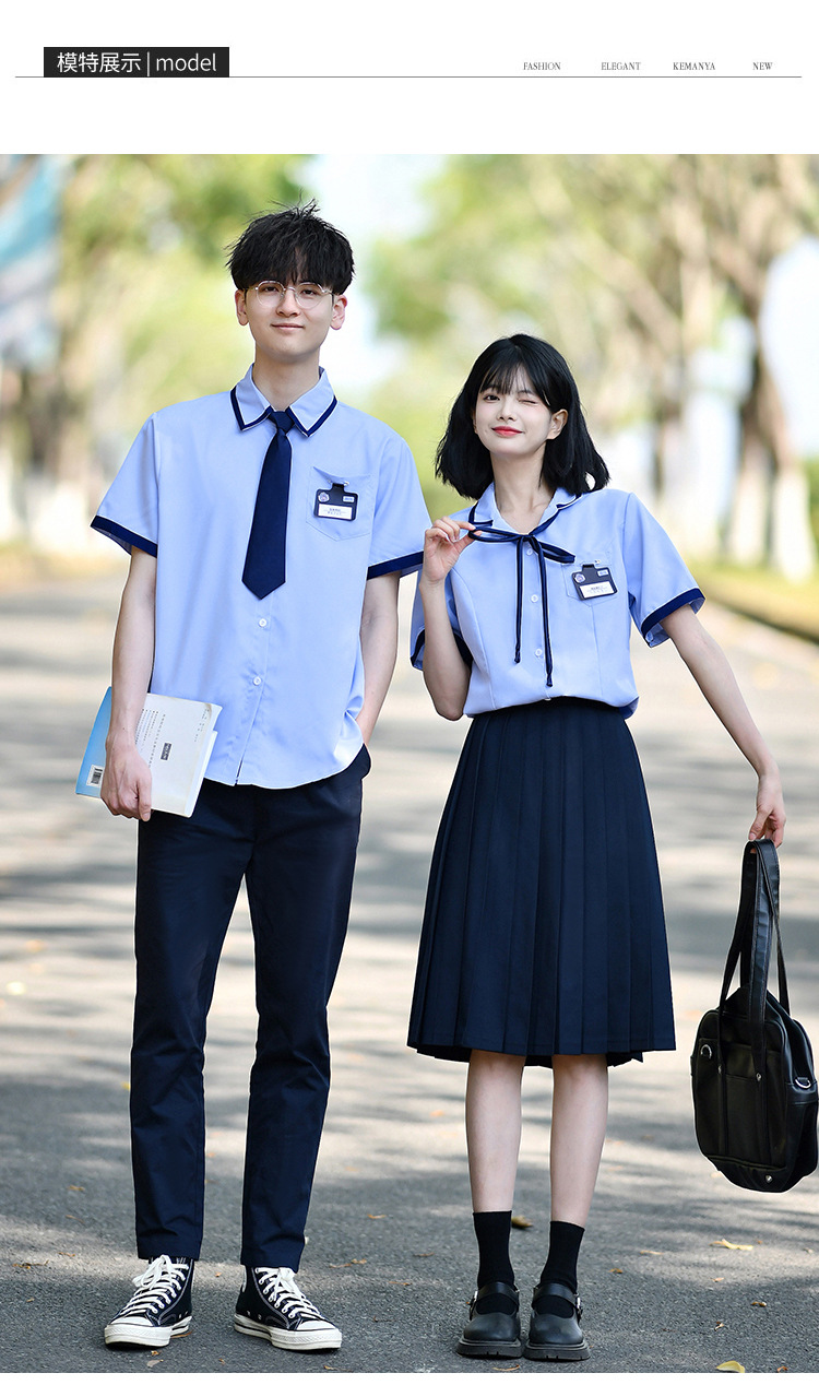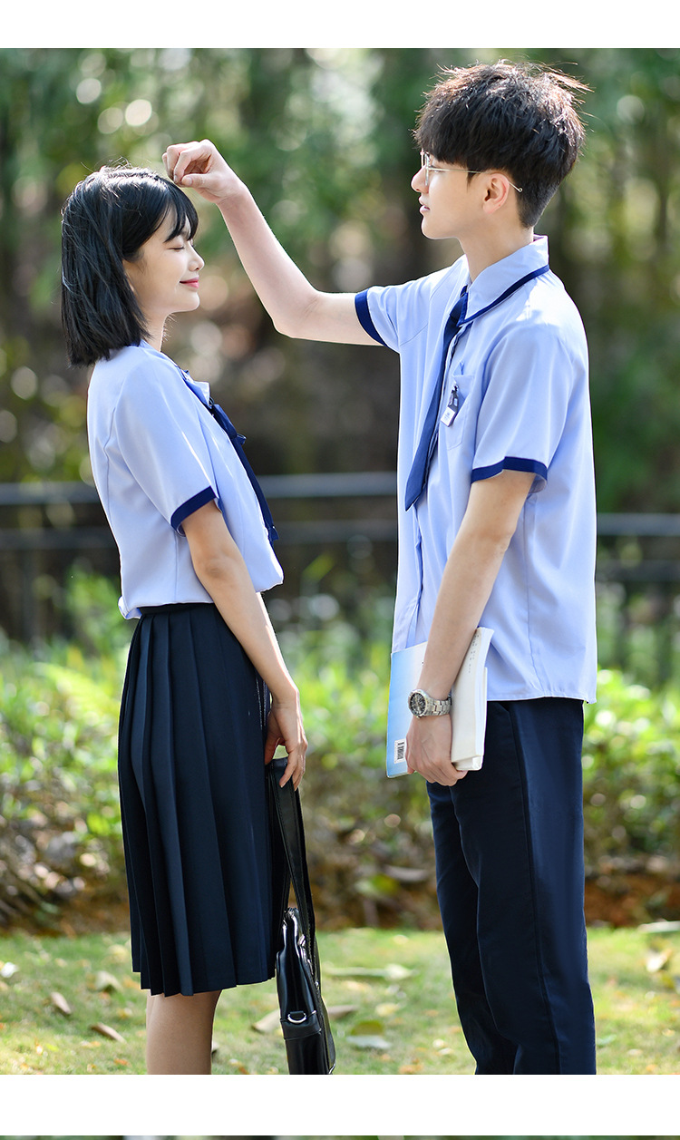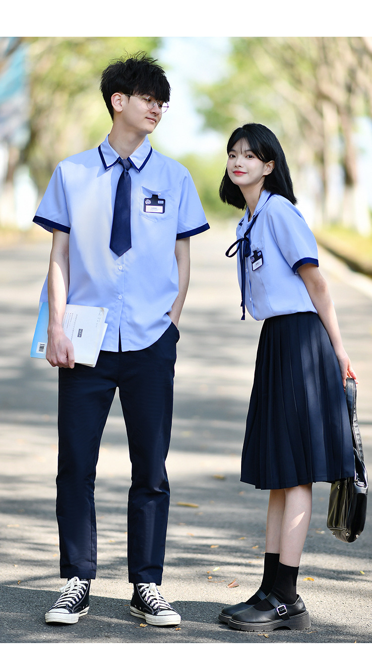 Значок галстука рубашки для мальчиков; Значок воротник рубашки для девочек; Синие брюки; Синяя плиссированная юбка