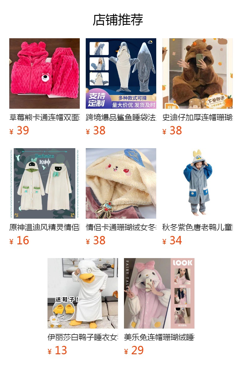 лисий халат; Платье и брюки лисы; рубашка летучей мыши; Халат и брюки летучей мыши; Классическая ночная рубашка с пандой; Классические брюки Panda Plus; халат динозавра; Халат и штаны динозавра; Маленький халатик енота; Маленький халат и штаны енота; Ночная рубашка Капибала; Халат и брюки капибала; Маленький пчелиный медвежий халат; Маленький пчелиный медвежонок, халат и штаны; Ночная рубашка Хацунэ; Халат и брюки Хацунэ; Ночная рубашка для собаки-шефа; Халат и штаны для собаки-повара; Ночная рубашка с изображением кота КТ; Пижама и штаны для кошек KT; халат Салливана; халат и брюки Салливана; Синий халат в золотом стиле; Синий халат и брюки в золотом стиле; Ночная рубашка Куроми с вышивкой на спине; Халат Куроми с вышивкой на спине и брюки.; халат акулы; Халат и брюки в виде акулы; Халат кролика Майле; Халат и штаны кролика Майле; Ночная рубашка Мелодия; Ночная рубашка и брюки Melody; халат рыбы-клоуна; Халат и штаны в виде рыбы-клоуна; Пижама с большими глазами; Халат и штаны мальчика с большими глазами; Утолщенный халат с клубничным медведем; Утолщенный клубничный мишка и штаны; накидка Микки; Накидка и штаны Микки; Синий халат Стич; Синий халат и брюки Stitch; Розовый халат Стич; Розовый халат и брюки Stitch; Трехмерный халат в виде акулы; Трехмерный халат и штаны в виде акулы; Клубничный медвежий халат; Халат и штаны клубничного мишки; Темный халат акулы; Темная акула и брюки; Собачий халат с корицей; Халат и штаны для собаки корицы; Зеленый халат для собаки Пача; Зеленый халат и штаны для собаки Пача; Серая ночная рубашка для собаки Пача; Серая собака Пача и штаны; Белоснежная ночная рубашка; Белоснежка и штаны; Халат Крейон Шин-чан; Пижама и штаны с изображением Шин-чана; пингвиний халат; Халат и туфли пингвина; Утиная ночная рубашка; Обувь Kodak Duck Plus; Белая эллисберийская ночная рубашка; Избранная ночная рубашка и туфли белого цвета; черный утиный халат; Черный утиный халат и туфли; Бежевый утиный халат; Бежевый утиный халат и туфли; Утолщенный халат из енота; Утолщенный халат и брюки из енота.; Забавная рыбка с толстой головой; Забавная рыба с толстой головой и туфлями; Кейт Кэт Кейп; Плащ и брюки для кошки Кейт; халат таксона; Пижамы и брюки с изображением таксы; Беловатая рыба с крупной головой; Кремовая рыба с головой-головой и обувью