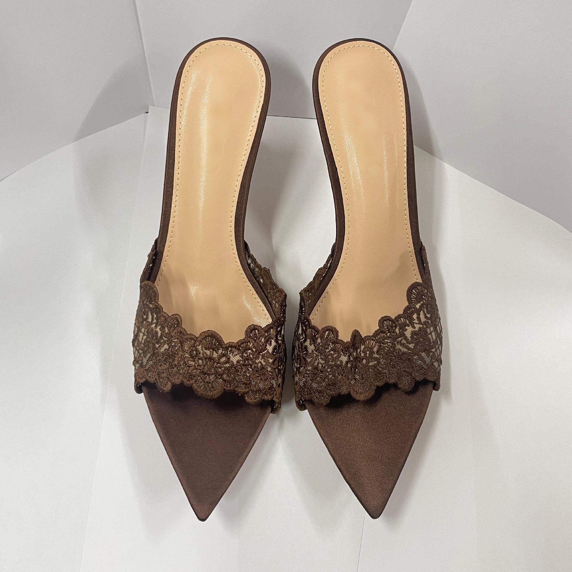 Летние босоножки 2025 года из Хуйчжоу, европейский и американский стиль, заостренный носок, шпилька, кружево, высокий каблук, однотонные, шампань, модные летние сандалии.