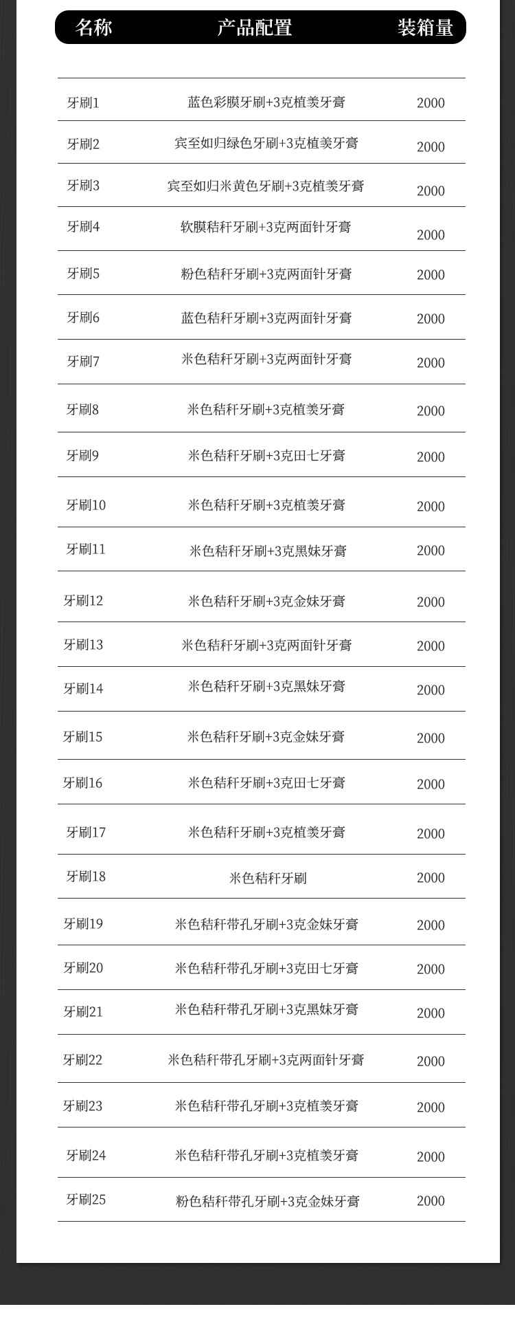 Зубная щетка из бежевой соломы + зубная паста с двусторонней иглой 3 г 2000/коробка; Зубная щетка из бежевой соломы + 3 г черной зубной пасты для девочек 2000/коробка; Зубная щетка из бежевой соломы + зубная паста Jinmei 3 г 2000/коробка; Зубная щетка из бежевой соломы + зубная паста Tianqi 3 г 2000/коробка; Зубная щетка из бежевой соломы с отверстиями + зубная паста Jinmei 3 г 2000/коробка; Зубная щетка из бежевой соломы с отверстиями + зубная паста Tianqi 3 г 2000/коробка; Зубная щетка из бежевой соломы с отверстиями + 3 г черной зубной пасты для девочек 2000/коробка; Зубная щетка из бежевой соломы с отверстиями + зубная паста с двусторонней иглой 3 г 2000/коробка; Зубная щетка из бежевой соломы с отверстиями + зубная паста 3 г Zhixian 2000/коробка; Соломенная зубная щетка из мягкой пленки + зубная паста с двусторонней иглой 3 г 2000/коробка; Зубная щетка из бежевой соломы + зубная паста 3 г Zhixian 2000/коробка; Зеленая зубная щетка Binji Rui + 3 г Zhixian зубной пасты 2000/коробка; Зубная щетка из розовой соломы + зубная паста Jinmei 3 г 2000/коробка; Зубная щетка из бежевой соломы 2000/коробка; Желтая зубная щетка Binji Rui + 3 г Zhixian зубной пасты 2000/коробка; Зубная щетка синего цвета + зубная паста Zhixian 3 г 2000/коробка; Зубная щетка из розовой соломы + зубная паста с двусторонней иглой 3 г 2000/коробка; Зубная щетка из синей соломы + зубная паста с двусторонней иглой 3 г 2000/коробка; Мягкая пленочная бежевая соломенная зубная щетка + 3 г Zhixian зубная паста, поворотный колпачок 2000/коробка; Мягкая пленочная бежевая соломенная зубная щетка + зубная паста Tianqi 3 г 2000/коробка; Мягкая пленочная бежевая соломенная зубная щетка + 3 г Zhixian зубной пасты 2000/коробка; Мягкая пленочная бежевая соломенная зубная щетка + 3 г черной зубной пасты для девочек 2000/коробка; Мягкая пленочная бежевая соломенная зубная щетка + зубная паста Jinmei 3 г 2000/коробка