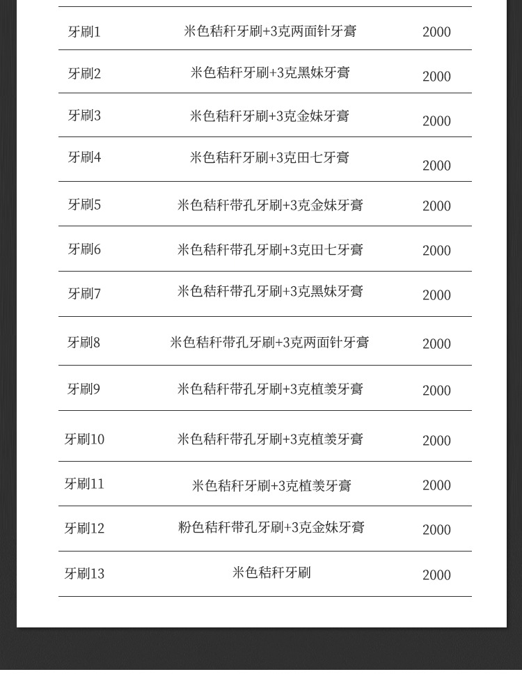 Зубная щетка бежевая соломенная 2000/кор.; Зубная щетка из розовой соломки + зубная паста Jinmei 3 г 2000 шт./кор.; Бежевая соломенная зубная щетка + 3 г зубной пасты Kaoshixiao Zhixian 2000/кор.; Зубная щетка бежевая соломенная с отверстиями + зубная паста Zhixian 3г 2000/кор; Зубная щетка бежевая соломенная + зубная паста Zhixian 3г 2000/кор; Зубная щетка бежевая соломенная с отверстиями + зубная паста с двусторонней иглой 3г 2000/кор.; Зубная щетка бежевая соломенная с отверстиями + зубная паста для девочек 3г черная 2000/кор.; Бежевая соломенная зубная щетка с отверстиями + зубная паста Tianqi 3г 2000/кор.; Зубная щетка бежевая соломенная с отверстиями + зубная паста Jinmei 3г 2000/кор; Бежевая соломенная зубная щетка + 3 г зубной пасты Tianqi 2000/кор.; Зубная щетка из бежевой соломки + зубная паста Jinmei 3 г 2000/кор.; Зубная щетка бежевая соломенная + зубная паста Heimei 3г 2000/кор; Зубная щетка соломенная бежевая + зубная паста с двусторонней иглой 3г 2000/кор.; Прозрачная зубная щетка с двусторонней иглой из чистого материала 4912 + зубная паста 5 г + прозрачная длинная расческа + утолщенная упаковка из полипропилена, набор «три в одном»