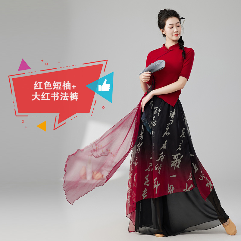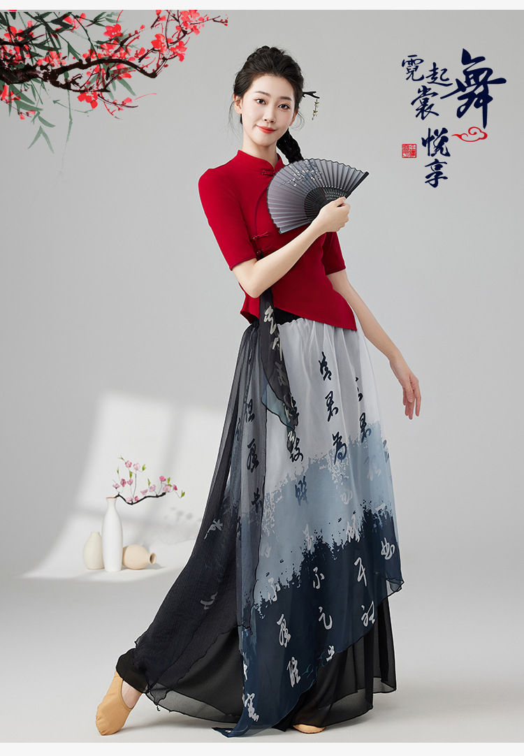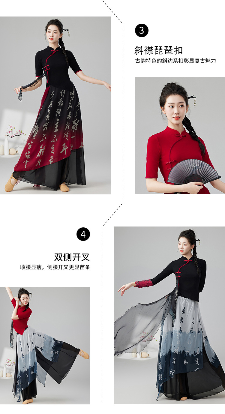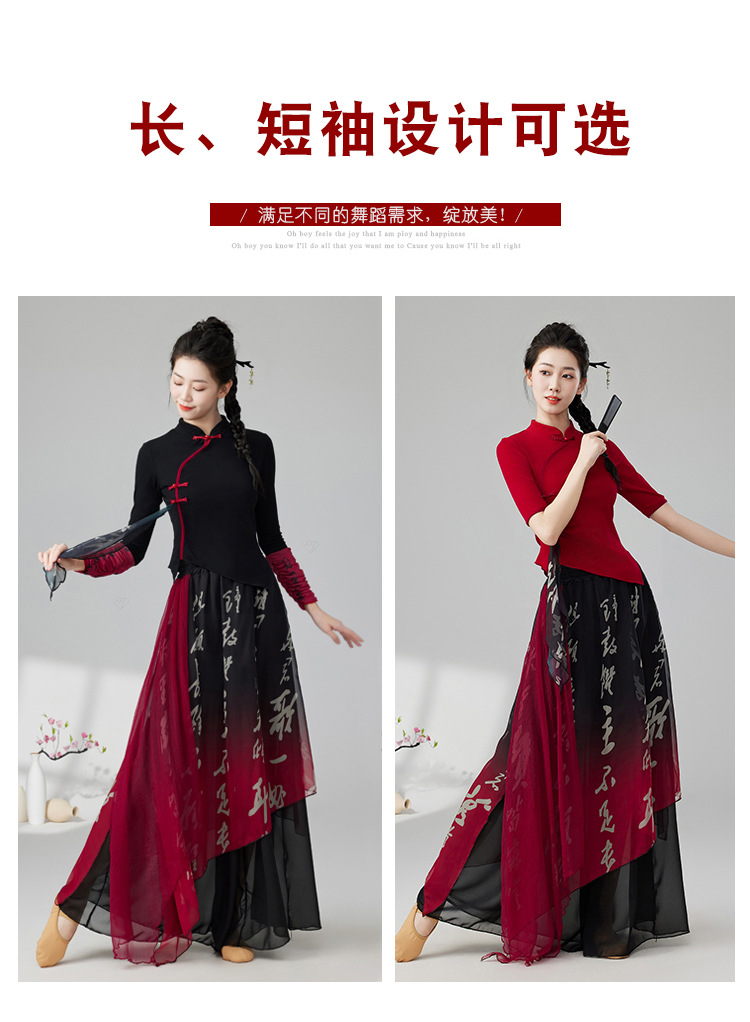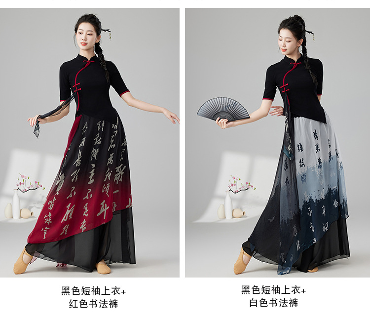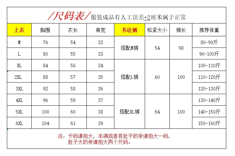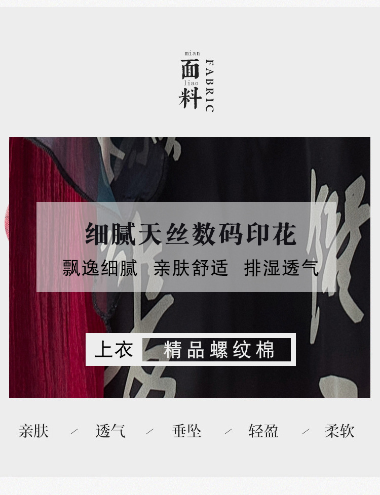 1.上衣为优质螺纹棉面料,书法裤为优质天丝面料,书法裤使用的是全幅印花工艺,全幅印花未改短,裤子更大气更飘逸,书法的印花内容能更好的体现,更上档次。