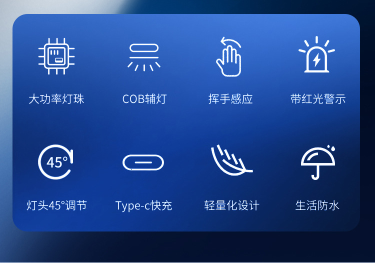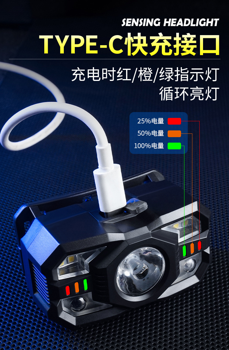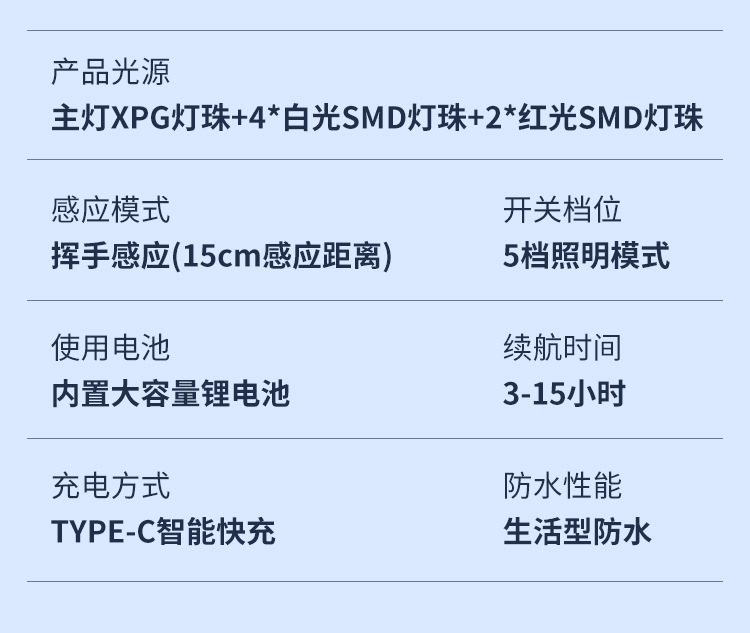 感应档位:主灯强光-主灯弱光-侧灯白光-侧灯红光-侧灯白红闪