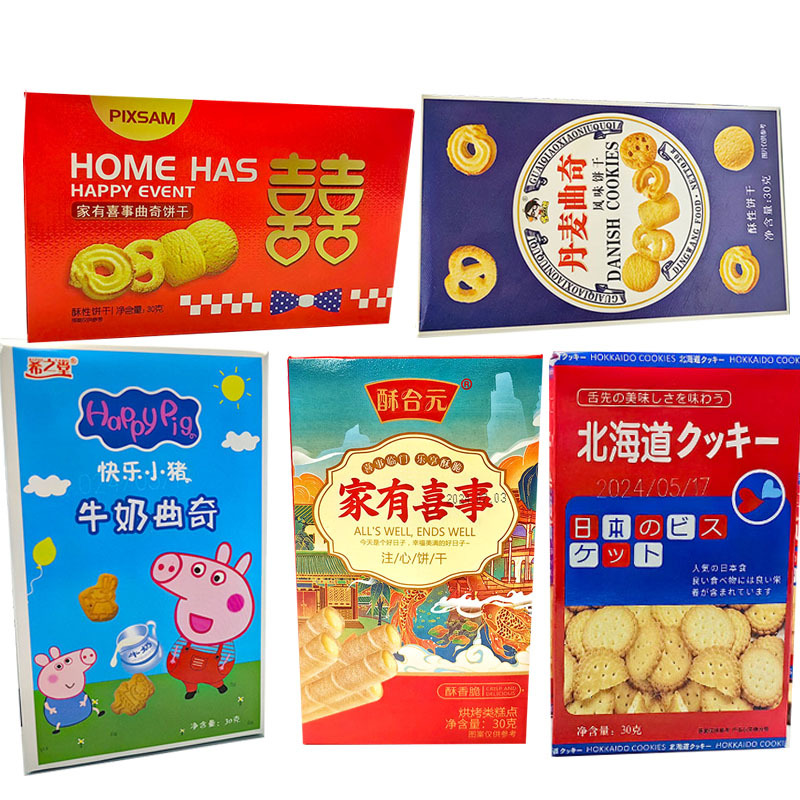 30 г молочного печенья Happy Piggy; 30 г печенья Макино Хоккайдо; 30 г вертикального датского печенья; 30 г печенья с клубникой и медведем; 30 г печенья Family Happy Event; 30 г печенья шаг за шагом; 30 г печенья Family Happy Event; 30 г печенья макарон