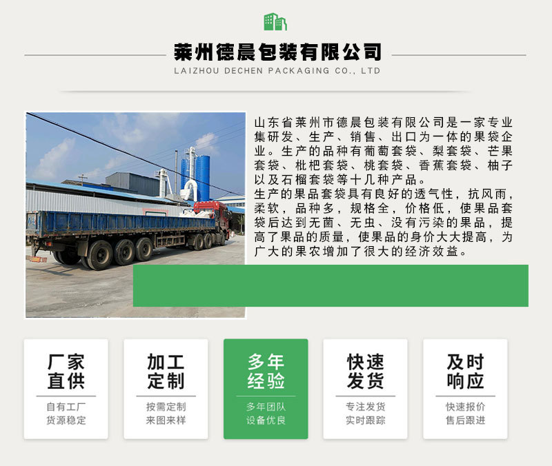 欢迎光临德晨德晨包装,我们现在开始出口加内销,我们在阿里巴巴国际站出口各种育果袋,出口到秘鲁,孟加拉,斯里兰卡,越南,泰国等,芒果袋,葡萄袋,柑橘袋畅销全世界,现出口转内销,出口质量,价格低廉,欢迎选购,量大直接联系客服,优惠价。