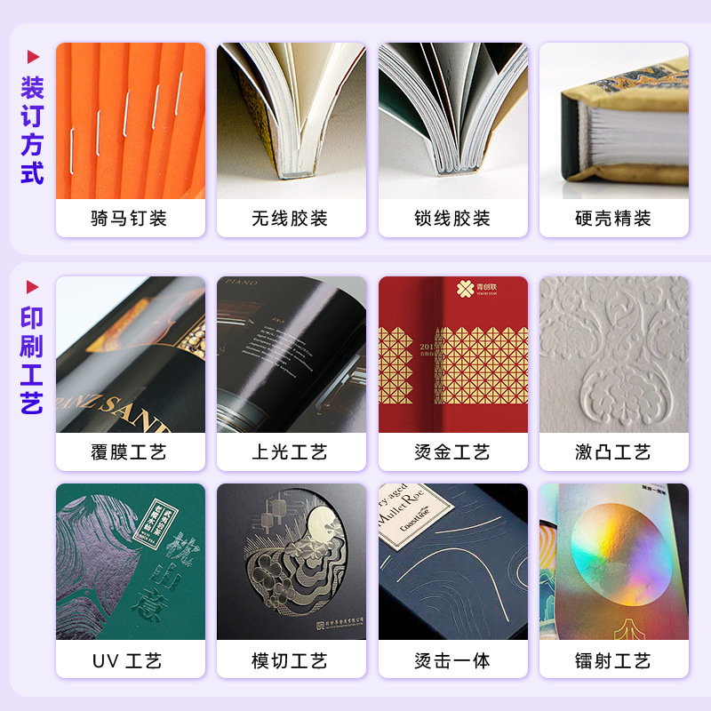 Переплет клеем, сшивание в седло, сшивание бабочкой, твердый переплет, переплет на кольцах и т. д.