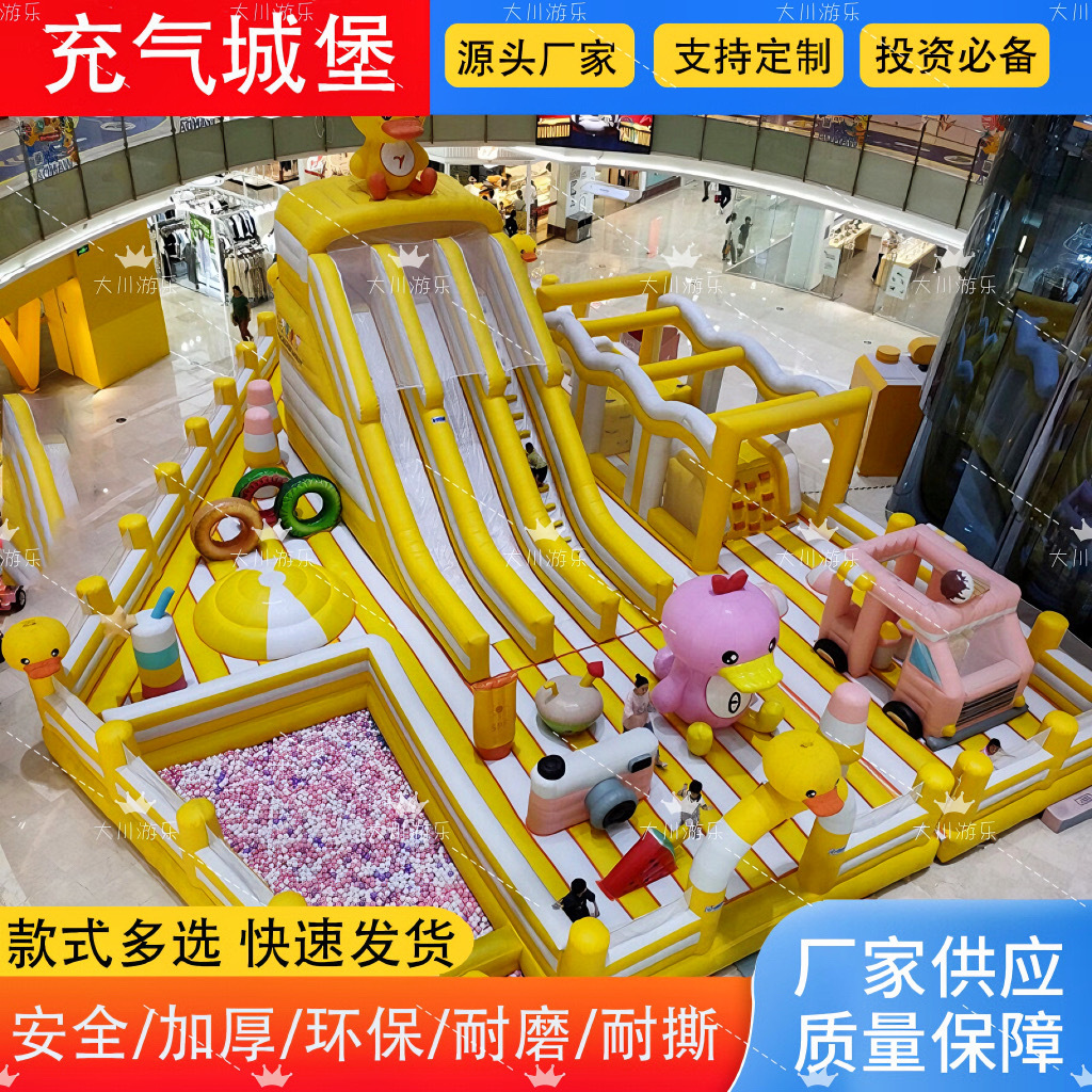 Новый надувной замок, уличный большой квадратный киоск, маленькая желтая утка, батут, горка, торговый центр, детский батут