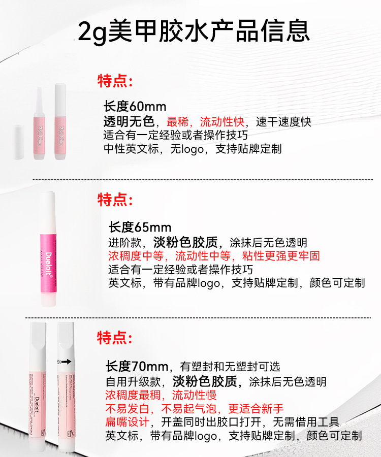 [Без этикетки] Круглый клей для рта, 2 г (60 мм); [Без этикетки] 2 г улучшенного порошкового клея (65 мм); [Без этикетки] 2 г улучшенного прозрачного клея (65 мм); [Без этикетки] 2 г порошкового клея с плоским горлышком, утолщенного типа (70 мм); [Английская этикетка] Клей для круглого рта, 2 г (60 мм); [Английская этикетка] 2 г улучшенного порошкового клея (65 мм); [Английская этикетка] 2 г порошкового клея с плоским ртом, утолщенного типа (70 мм); [Английская этикетка] 2 г порошкового клея с плоским горлышком, утолщенного типа - пластиковая герметизация (70 мм); [Китайская этикетка] 2 г жидкости для снятия лака (60 мм); [Английская этикетка] 2 г жидкости для снятия лака (60 мм); [Английская этикетка] Экологически чистый растворитель клея 2 г (65 мм) может быть экспортирован.; [Нейтральная этикетка] 2 г улучшенного порошкового клея (65 мм)