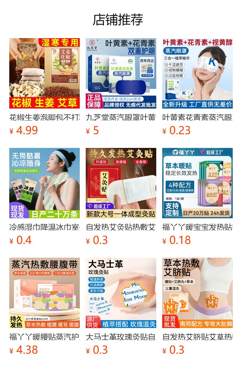Новая усовершенствованная паровая маска для глаз «три в одном» (один элемент); Цельный предмет без запаха; Специальная большая распродажа: одноразовые изделия без запаха (случайные цвета); Ароматизатор «Полынь» цельный; Полярник цельный (прозрачная распродажа); Лаванда цельная; Лаванда, одинарный лист; Ромашка в одиночных таблетках; Лютеин в одной таблетке; Новая лютеиновая таблетка; Агаровое дерево цельное; Семя кассии цельное; Монолист гиалуроновой кислоты; Розовый стиль, цельный элемент; Модернизированная детская 3D-маска для глаз с паровой маской для слепых; Версия без запаха (десять штук/пакет); Благовония из полыни (десять штук/пакет); Лаванда (десять штук/пакет); Ромашка (десять таблеток/пакетик); Лютеин (десять таблеток/пакет); Новый лютеин (десять таблеток/пакет); Тип агарового дерева (десять штук/пакет); Стиль семян кассии (десять штук/пакет); Гиалуроновая кислота (десять таблеток/пакет); Коробка из полыни (пять штук в коробке); Лавандовая коробка (пять таблеток в коробке); Коробка ромашки (пять таблеток в коробке); Коробка лютеина (пять таблеток в коробке); Распродажа коробок с полынью (пять штук в коробке); Розовая коробка (пять штук в коробке); Паровая маска для глаз с ароматом лимона (10 шт./упак.); Паровая маска для глаз со вкусом арбуза (10 шт./упак.); Паровая маска для глаз со вкусом черники (10 шт./упак.); Маска для глаз паровая со вкусом грейпфрута (10 шт./упак.); Черное дерево Жасмин (10 шт./кор.); Сандаловое персиковое цветение (10 шт./кор.); Груша из агарового дерева (10 шт./кор.); Ароматизатор «Зеленый чай» (10 таблеток/упаковка); Аромат черного чая (10 шт./кор.); Аромат белого чая (10 шт./кор.); Чай Улун (10 шт/кор.); Наклейки для согревания рук и ног с мультяшным дизайном, 1 коробка (упаковка из 10 штук); Согревающий пластырь для шеи; Горячий компресс для шеи, 1 коробка (7 штук); Теплая наколенник; 1 коробка с теплыми компрессами для коленей (6 штук); Теплый пластырь для поясницы и живота; 1 коробка с поясом для согревания живота (3 штуки); Теплый детский пластырь с полынью; Теплая детская красная нашивка с цветочным узором; Теплый детский пластырь с пустырником; Теплый детский имбирный пластырь; Коробка лейтоиновых охлаждающих патчей для глаз (7 штук в коробке); Одна коробка антоциановых патчей для глаз с черникой (7 шт./кор.); Патчи для глаз Chamomile Millefiori Ice, одна коробка (7 шт./кор.); Патчи для глаз с лютеином и черникой; Индивидуальная маска для глаз с ромашкой, 5 штук; Таблетки Lutein Ten по индивидуальному заказу