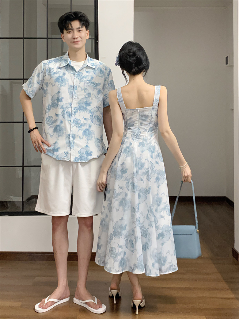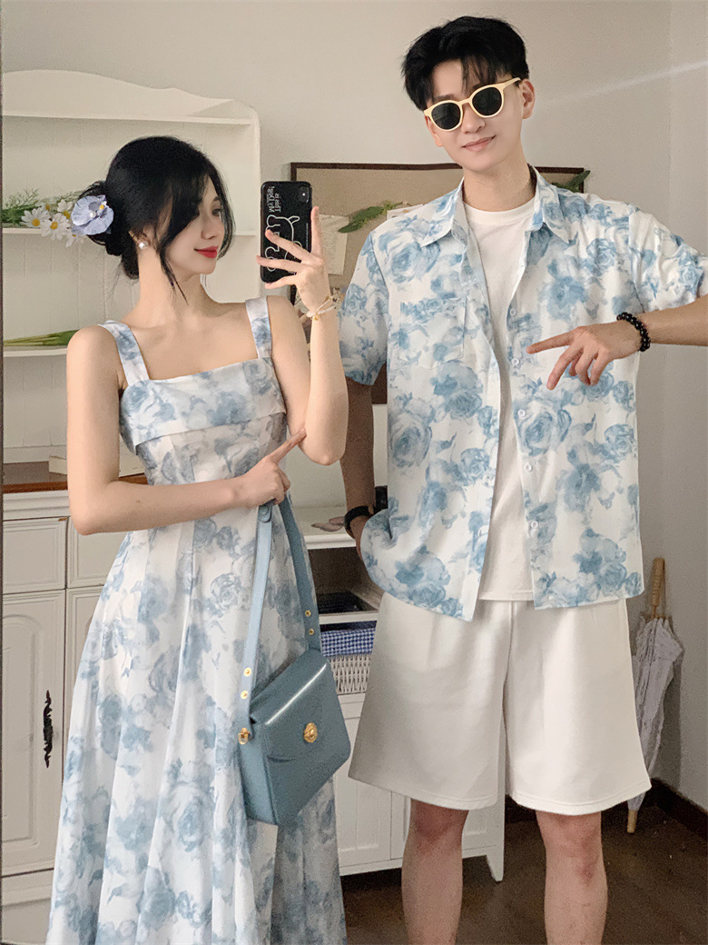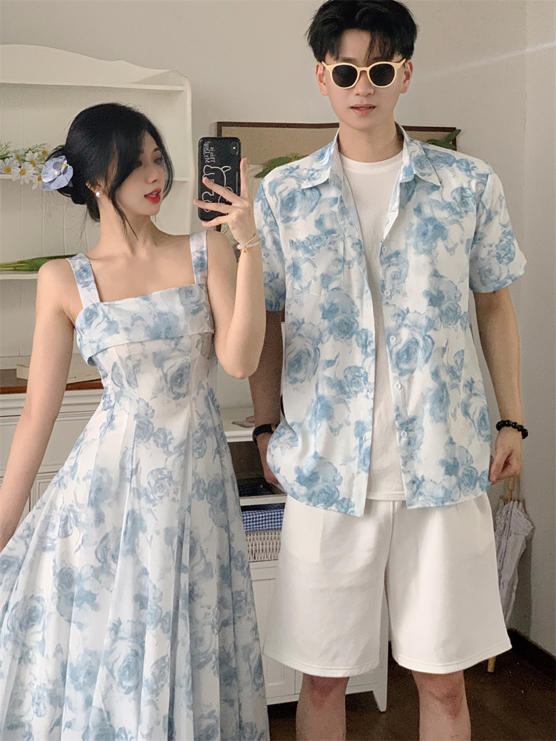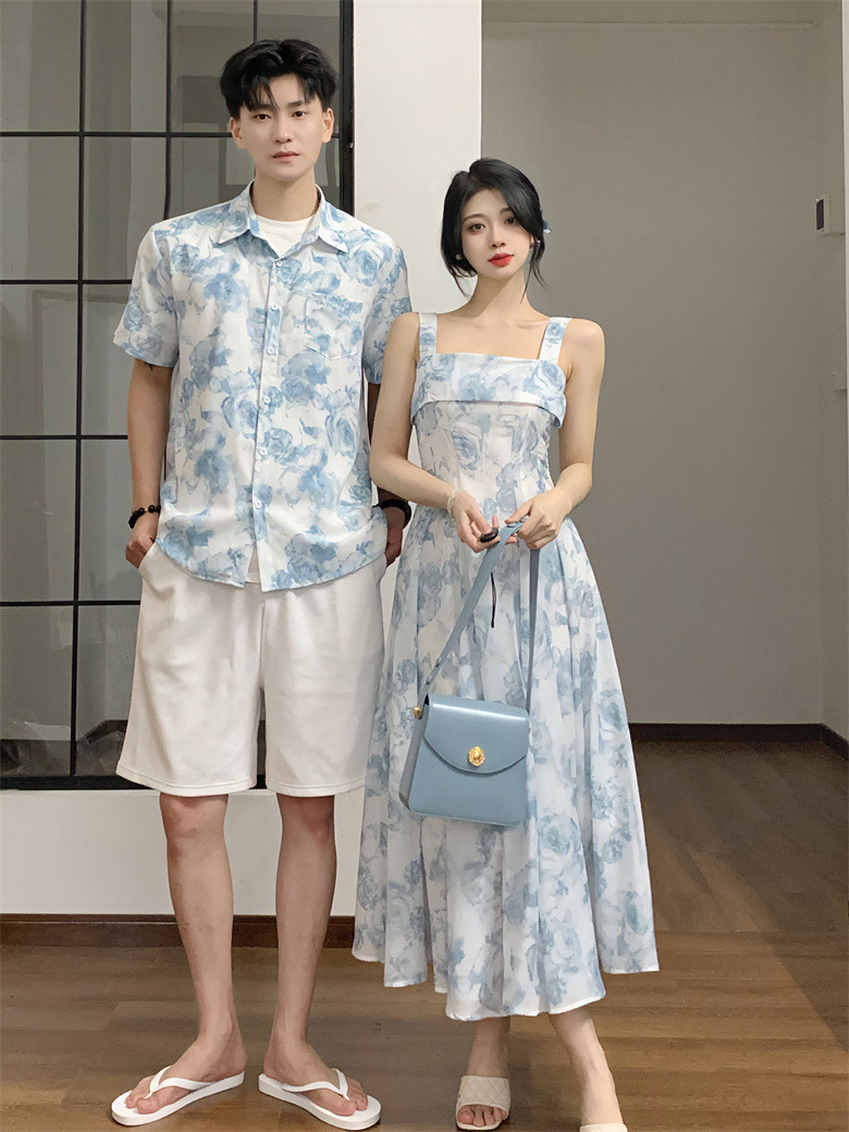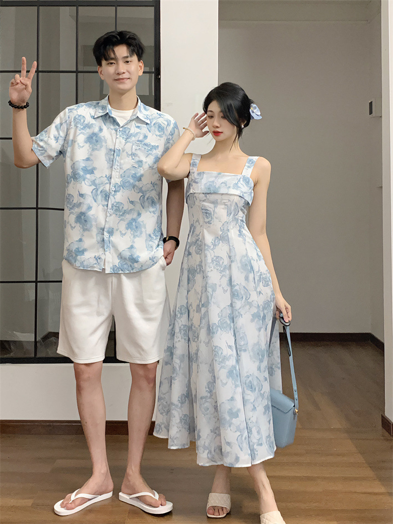 2024 Летний наряд для пар Женская розовая пляжная юбка облегающее темперамент платье мужская цветочная рубашка