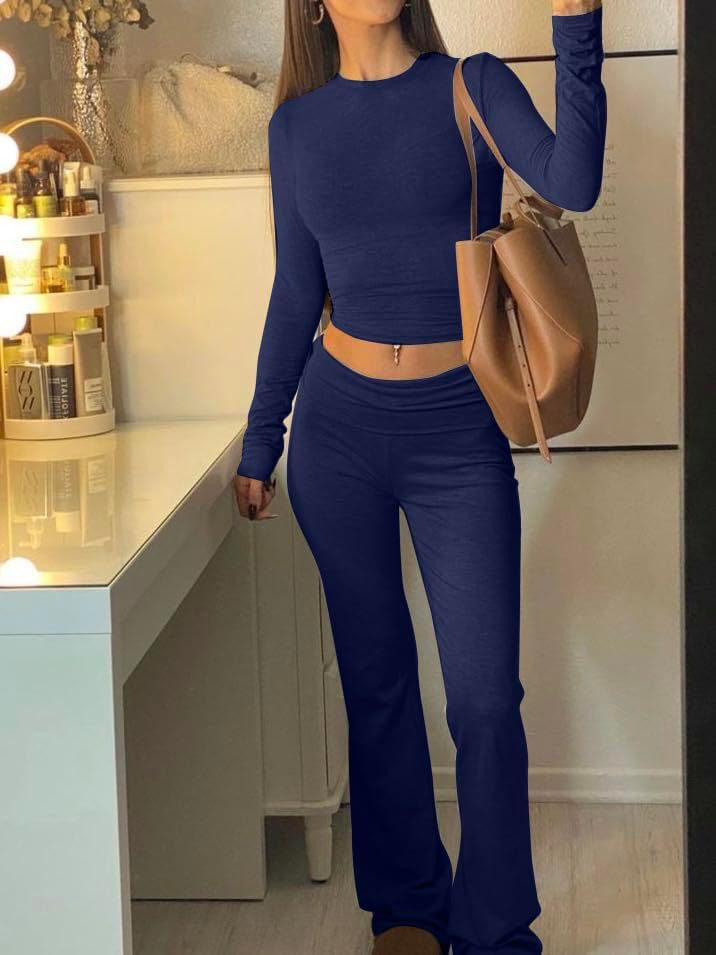 Внешняя торговля Досуг Женский набор из двух частей с круглым вырезом с длинным рукавом Низкая талия расклешенные брюки Спортивная одежда набор оптом два комплекта