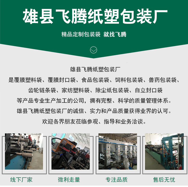 雄县飞腾纸塑包装厂是覆膜塑料袋、覆膜封口袋、食品包装袋、饲料包装袋、兽药包装袋、齿轮链条袋、家纺塑料袋、除尘纸包装袋、自立封口袋等产品专业生产加工的公司,拥有完整、科学的质量管理体系。雄县飞腾纸塑包装厂的诚信、实力和产品质量获得业界的认可。欢迎各界朋友莅临参观、指导和业务洽谈。