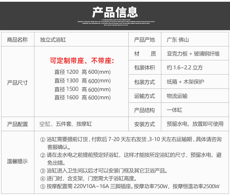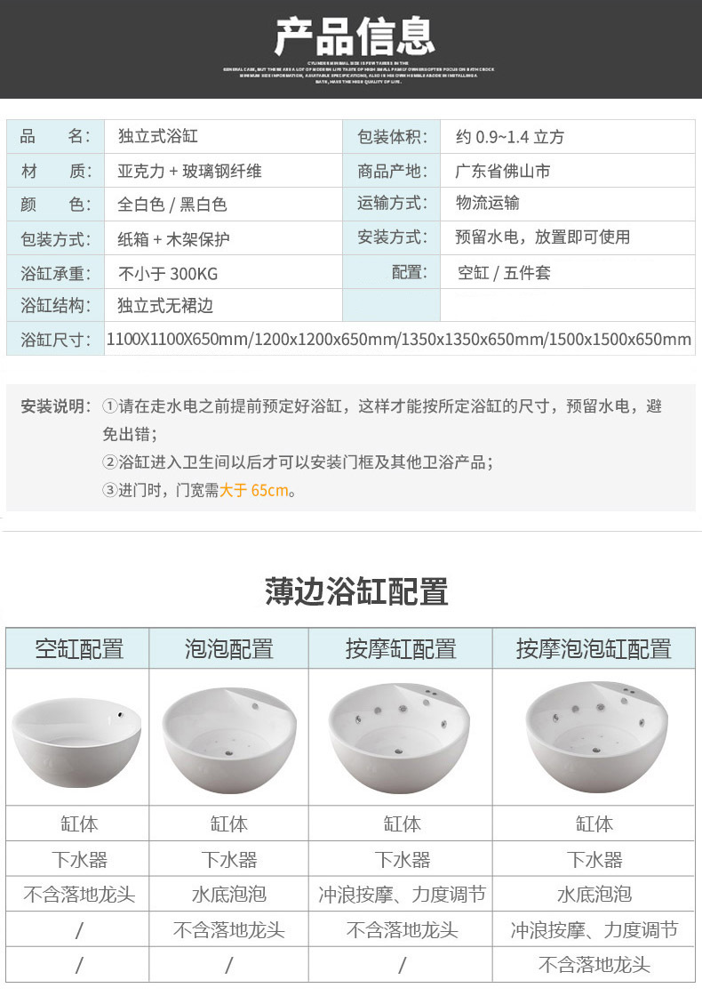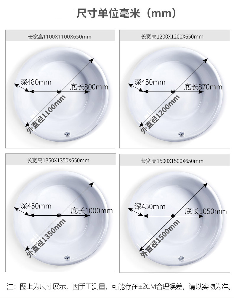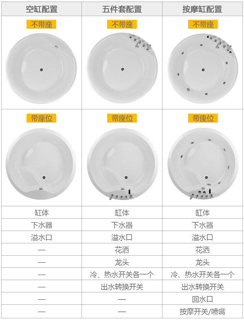 1000*1000*650 мм полный белый пустый цилиндр; 1100*1100*650 мм полный белый пустый цилиндр; 1200*1200*650 мм полный белый пустый цилиндр; 1300*1300*650 мм полный белый пустый цилиндр; 1350*1350*650mm Все белые пустые цилиндры; 1500*1500*650 мм полный белый пустый цилиндр; 1600*1600*650 мм полный белый пустый цилиндр; 1800*1800*650mm Все белые пустые цилиндры; Дополнительный кран из пяти частей; Дополнительная функция серфинга; Дополнительная нижняя светильная ванна; Дополнительная сенсорная компьютерная плата; Дополнительный напольный кран; Выберите только цвет красный/черный/желтый/зеленый/синий/серый)