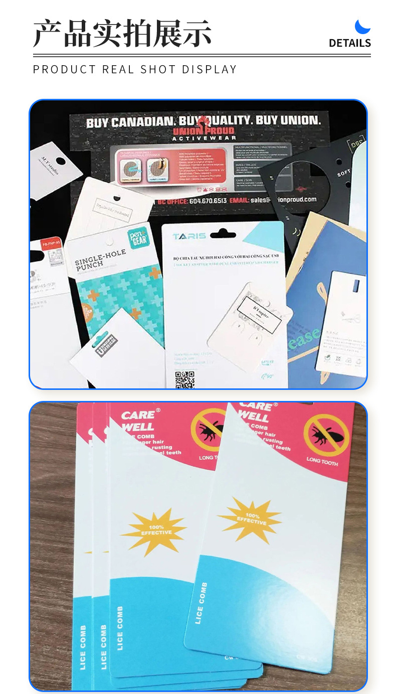 Блистерная карточка, держатель для карт, вкладыш для карточек с отверстием для подвешивания, цветная карточка, сложенная карточка с заголовком, подвесная карточка, карточка для переплета, печать, утолщенная ламинация и глянцевое покрытие.