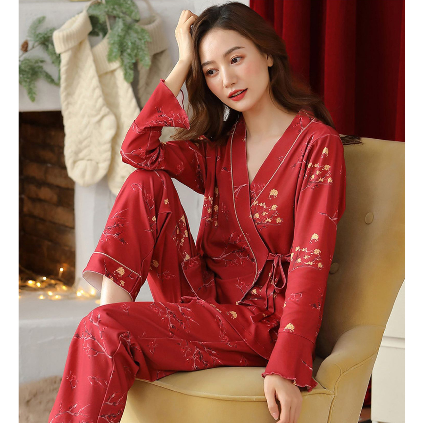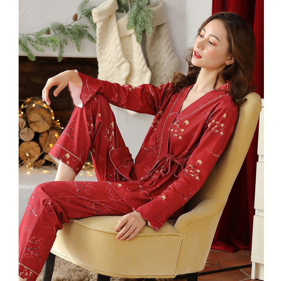 Красная пижама Женская весна и осень хлопок Осень с длинными рукавами больших размеров и высокой значением