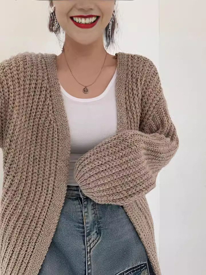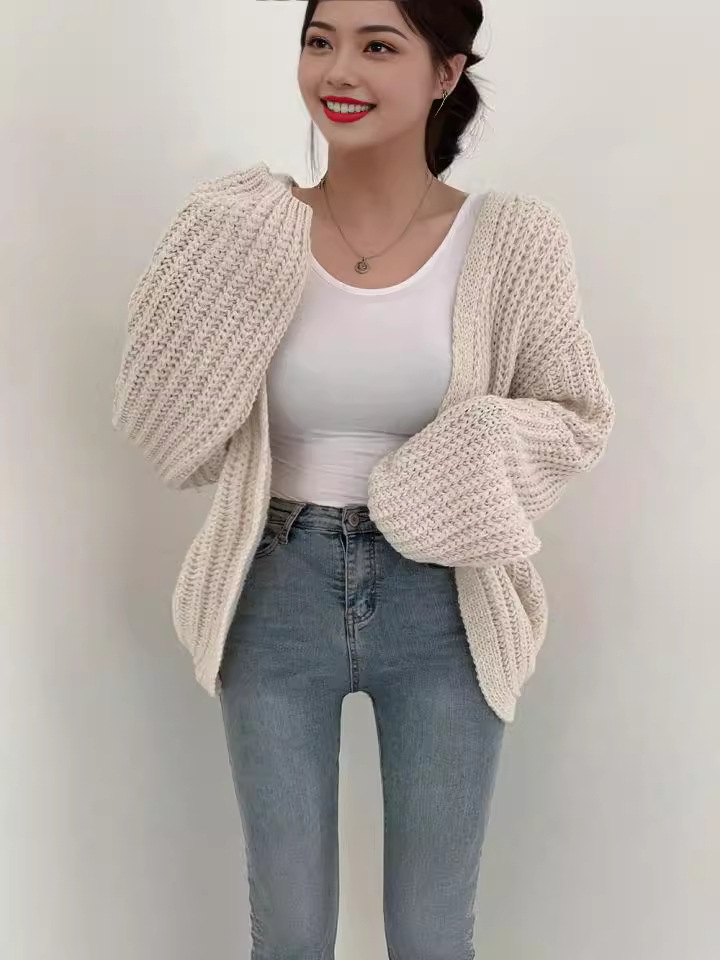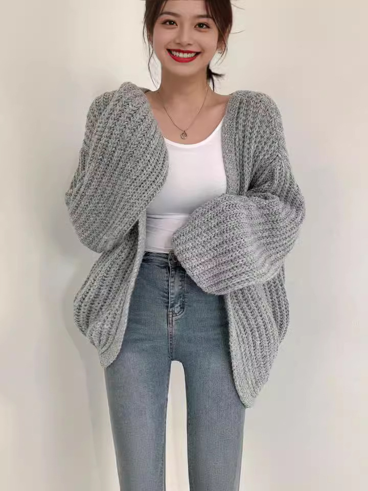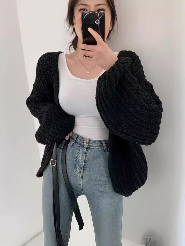 Korea chic осень ленивый ветер V-образный вырез дикий свободный повседневный сплошной рукав фонарь трикотажный кардиган свитер куртка