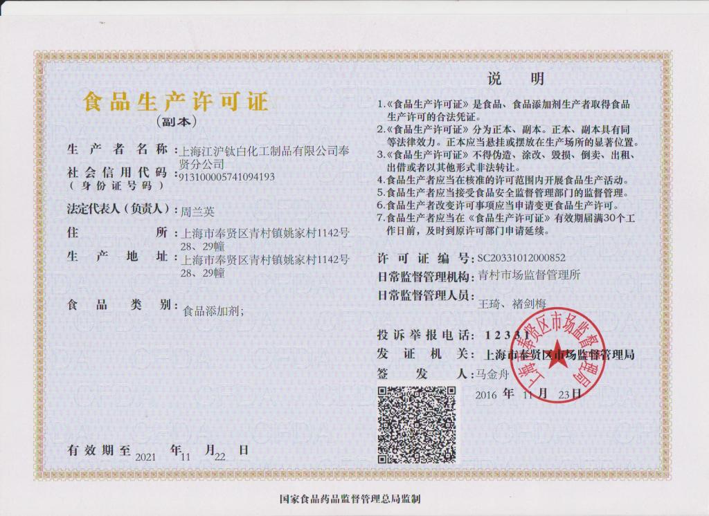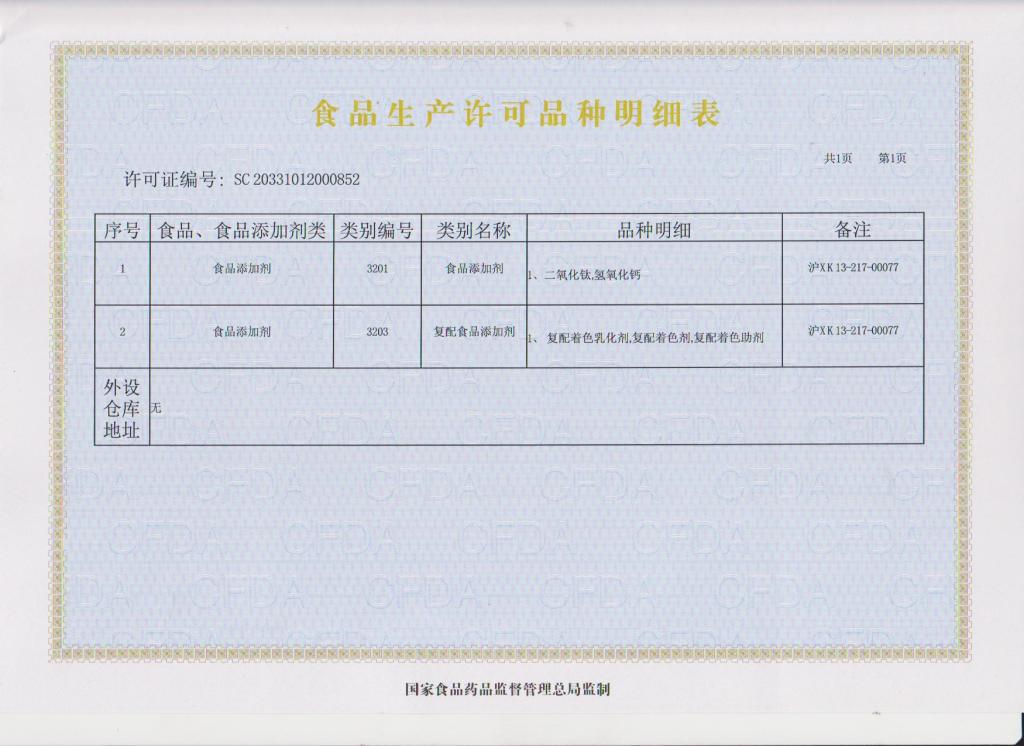 公司建有食品添加剂二氧化钛专用车间,食品添加剂氢氧化钙车间,医药级二氧化钛生产车间;复配着色剂(高分散型)车间;复配着色乳化剂车间