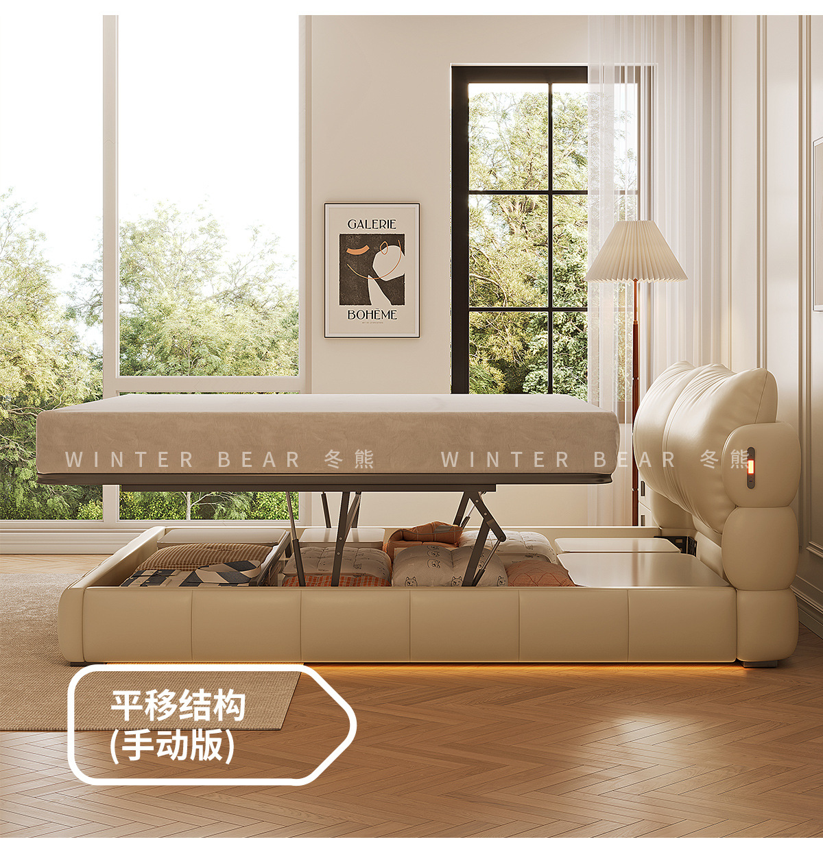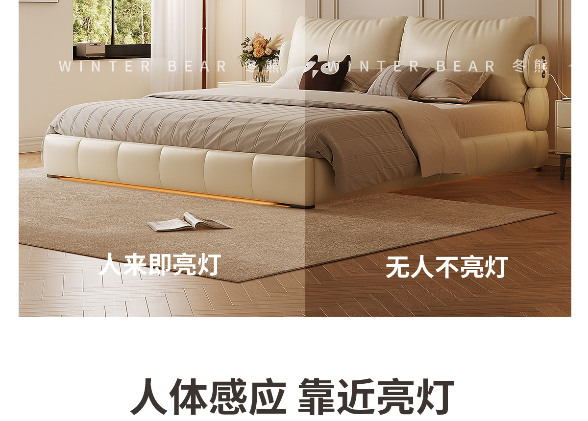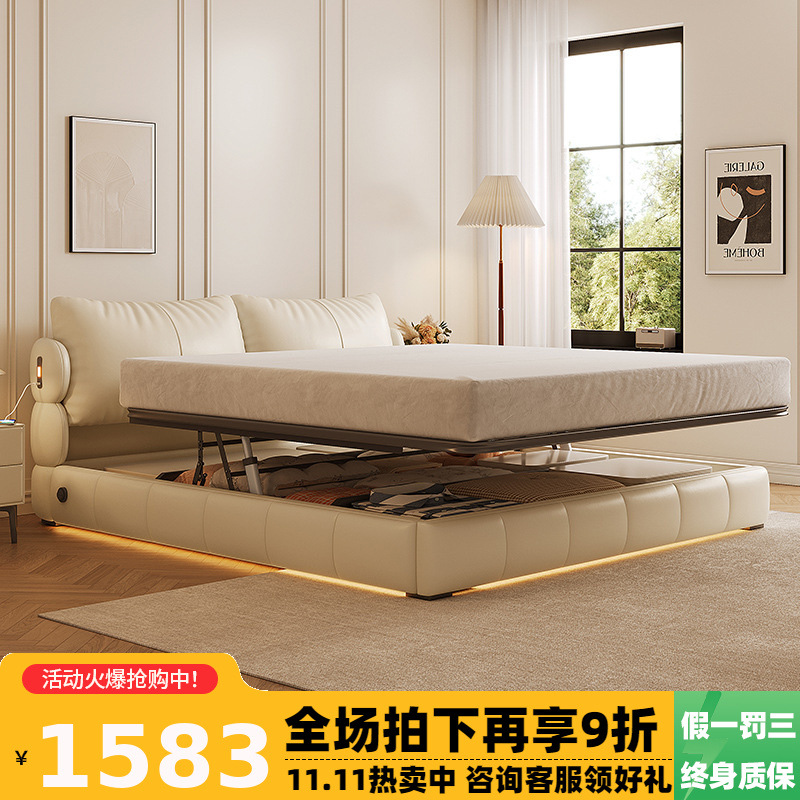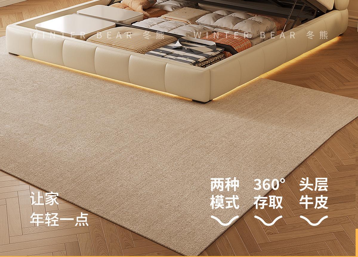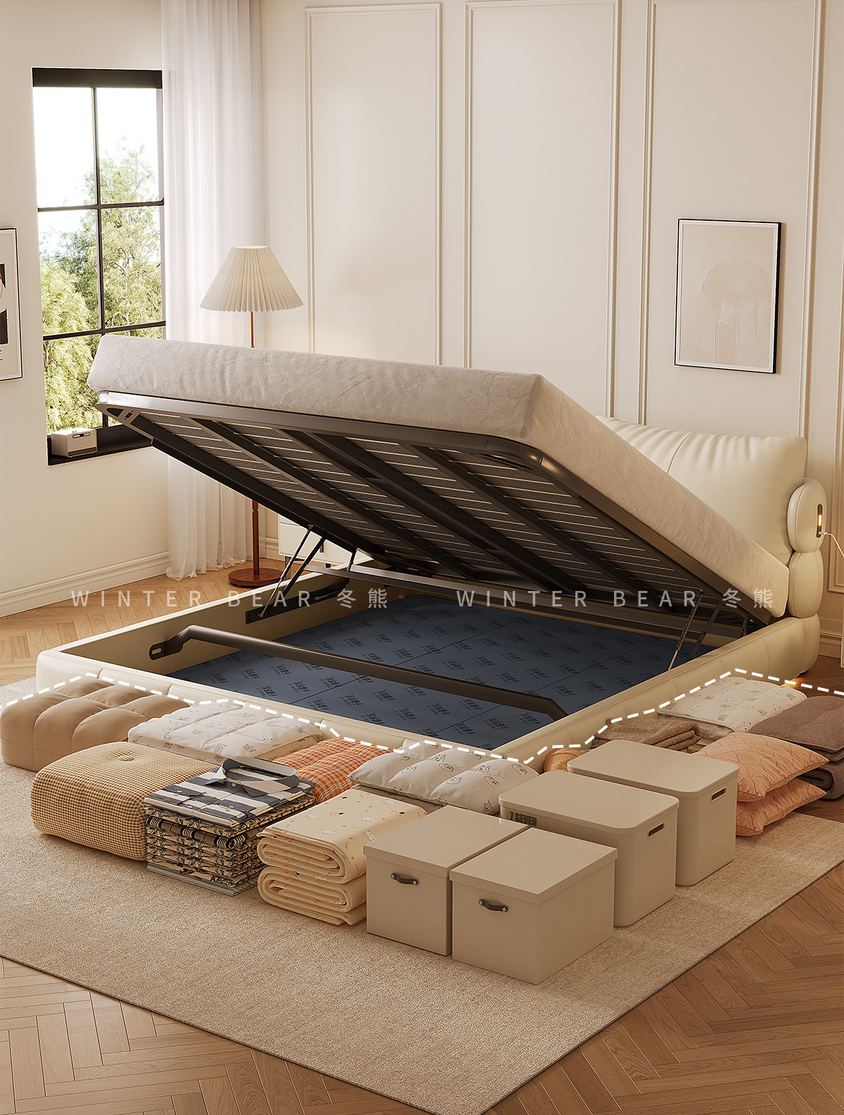 Двуспальная кровать с мягким изголовьем в стиле французского кремового цвета, с ящиками для хранения, электрическим механизмом подъема и обивкой из искусственной кожи «Зимний медведь».