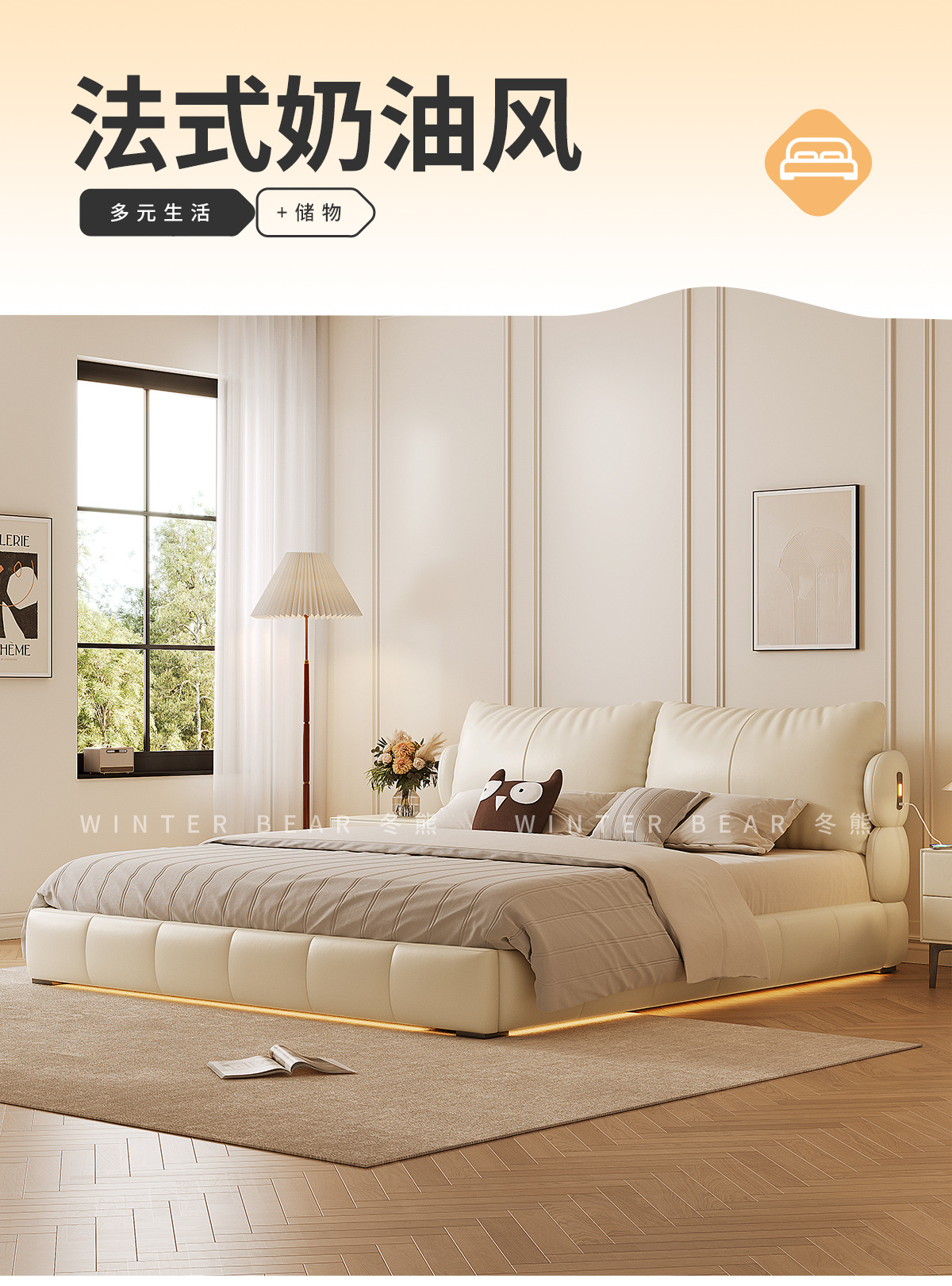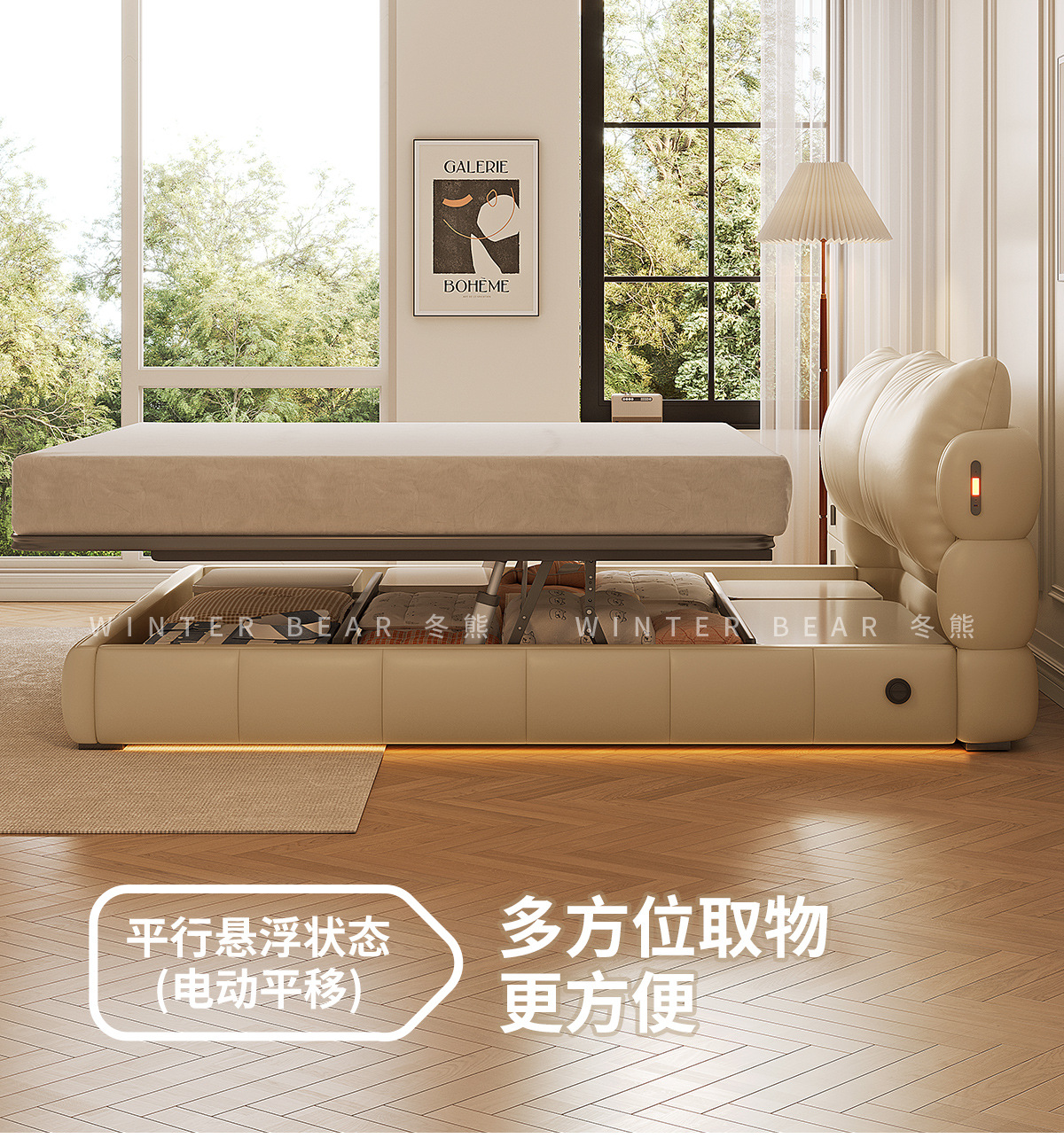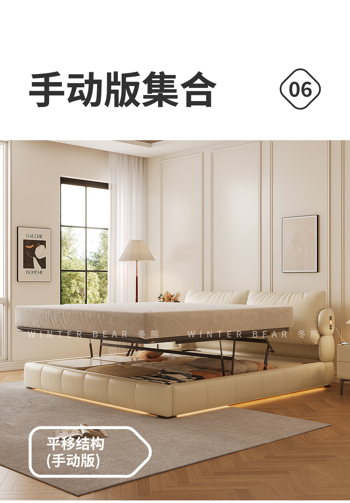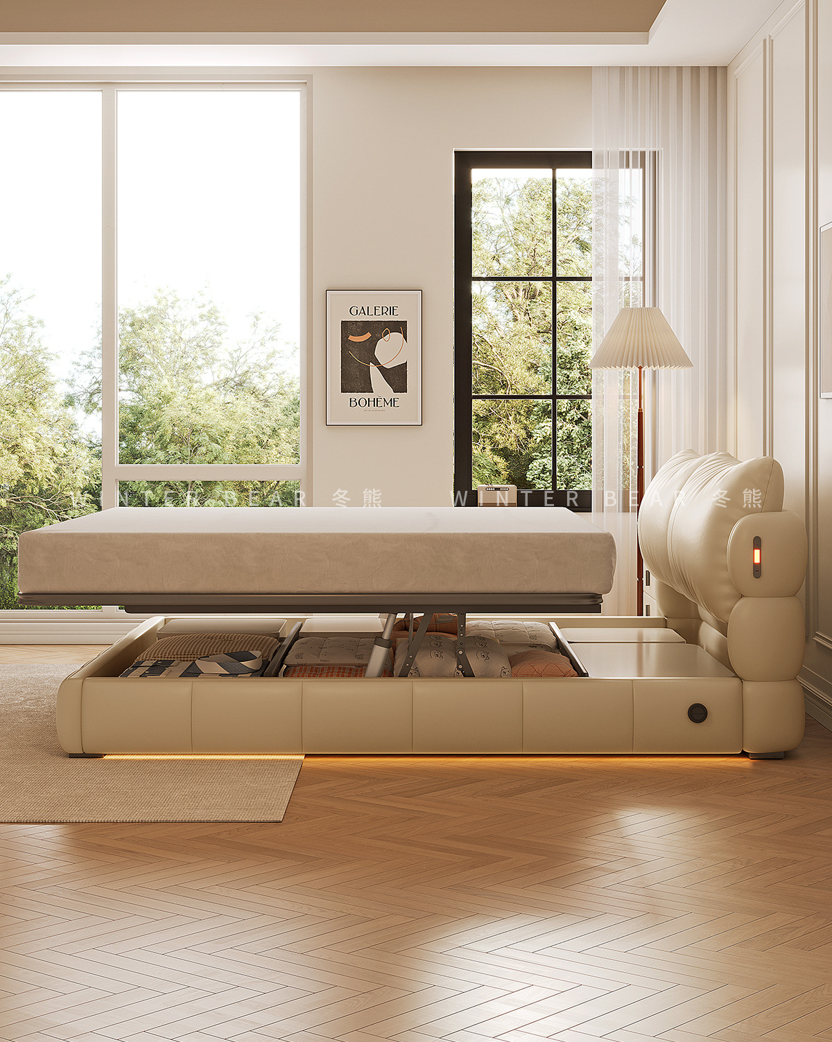 Двуспальная кровать с мягким изголовьем в стиле французского кремового цвета, с ящиками для хранения, электрическим механизмом подъема и обивкой из искусственной кожи «Зимний медведь».