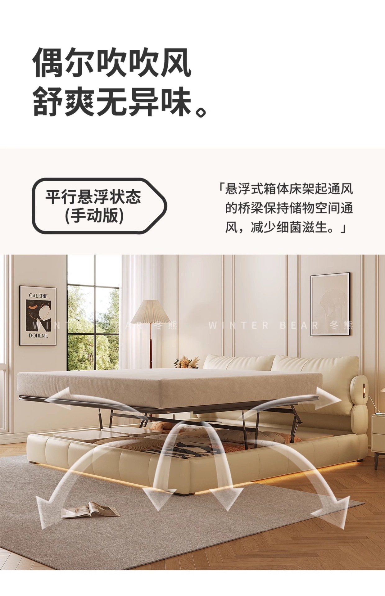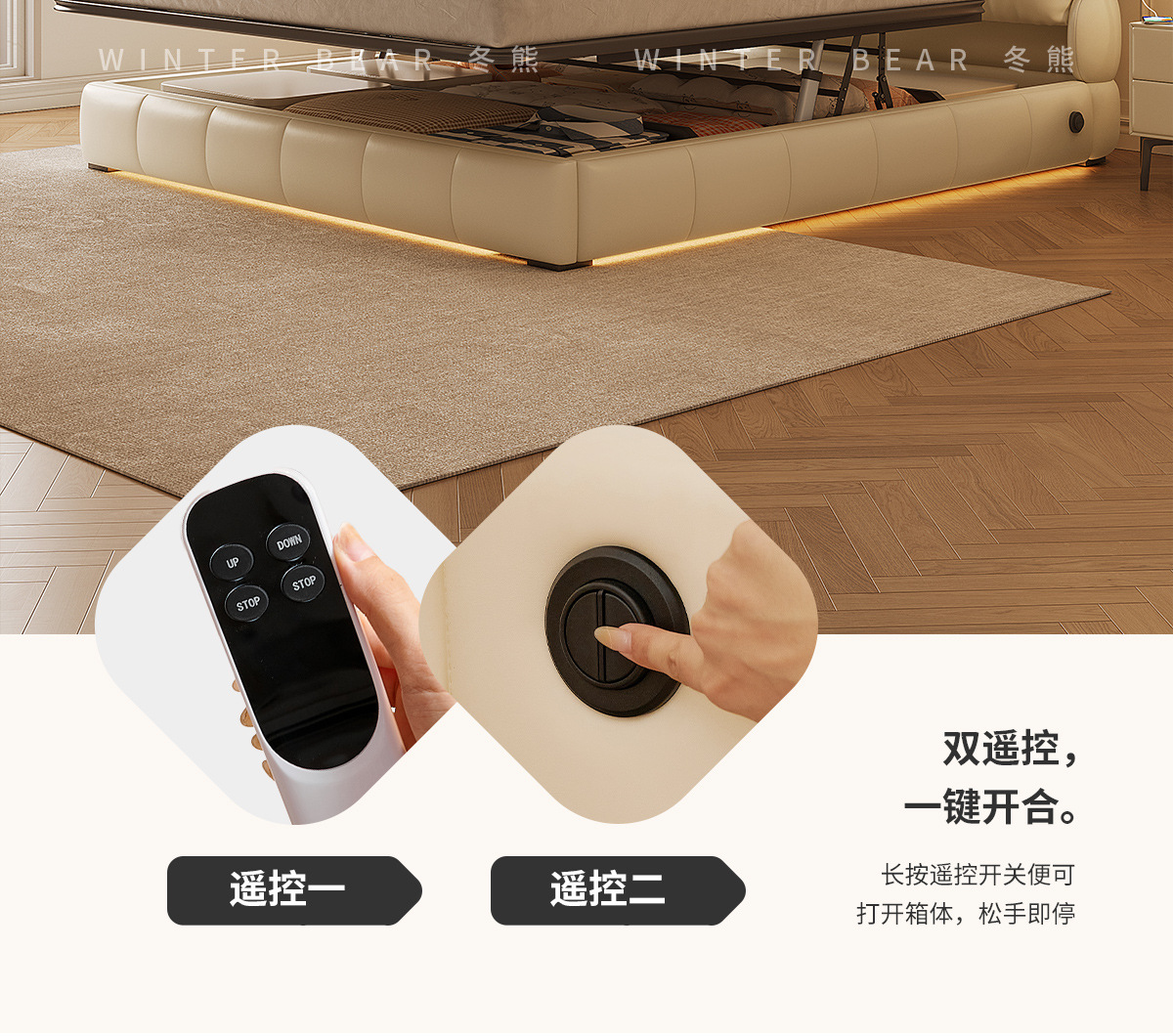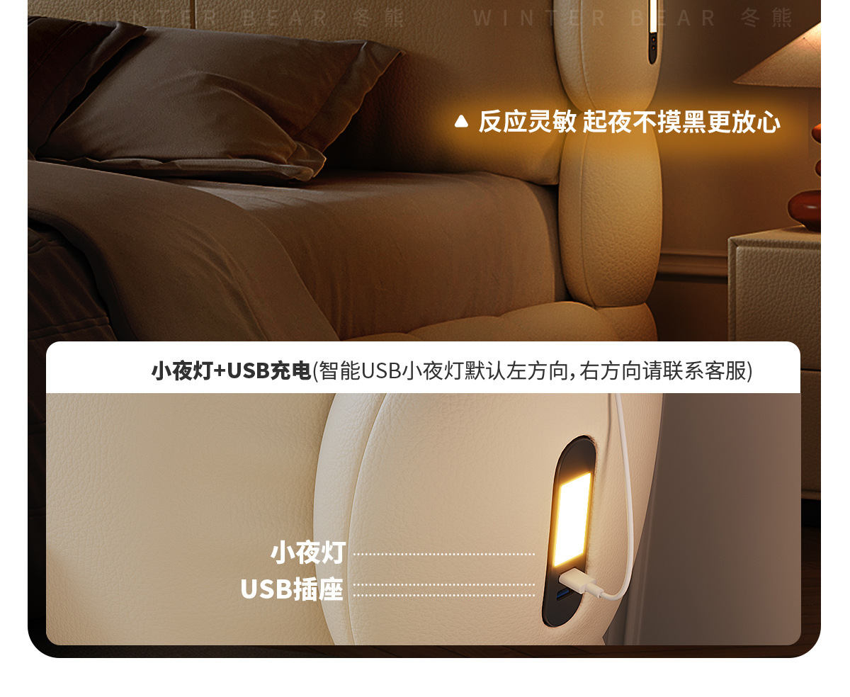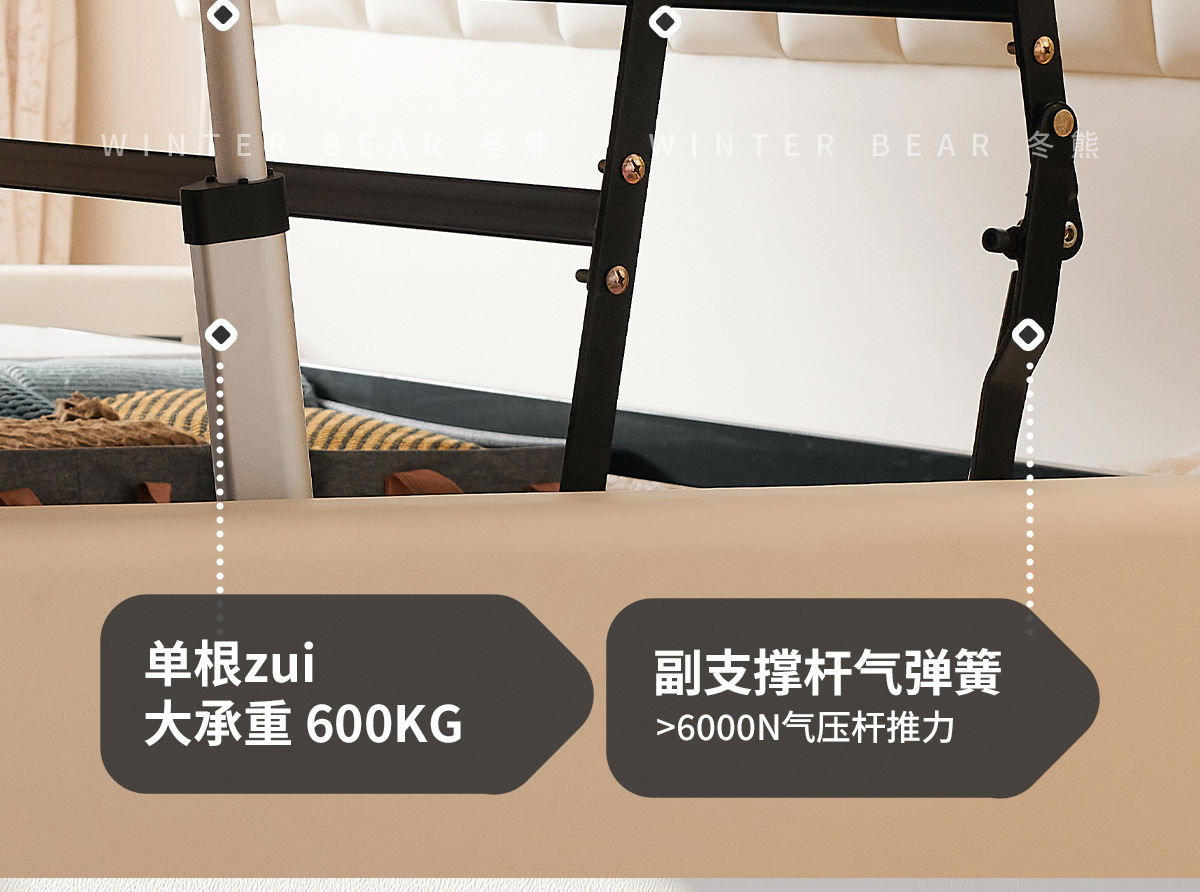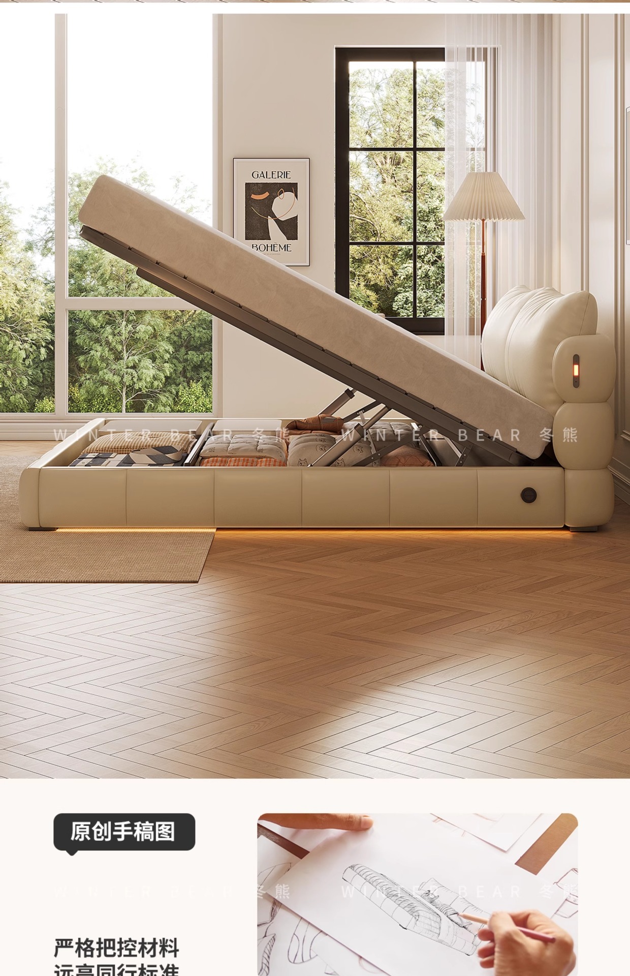 Двуспальная кровать с мягким изголовьем в стиле французского кремового цвета, с ящиками для хранения, электрическим механизмом подъема и обивкой из искусственной кожи «Зимний медведь».