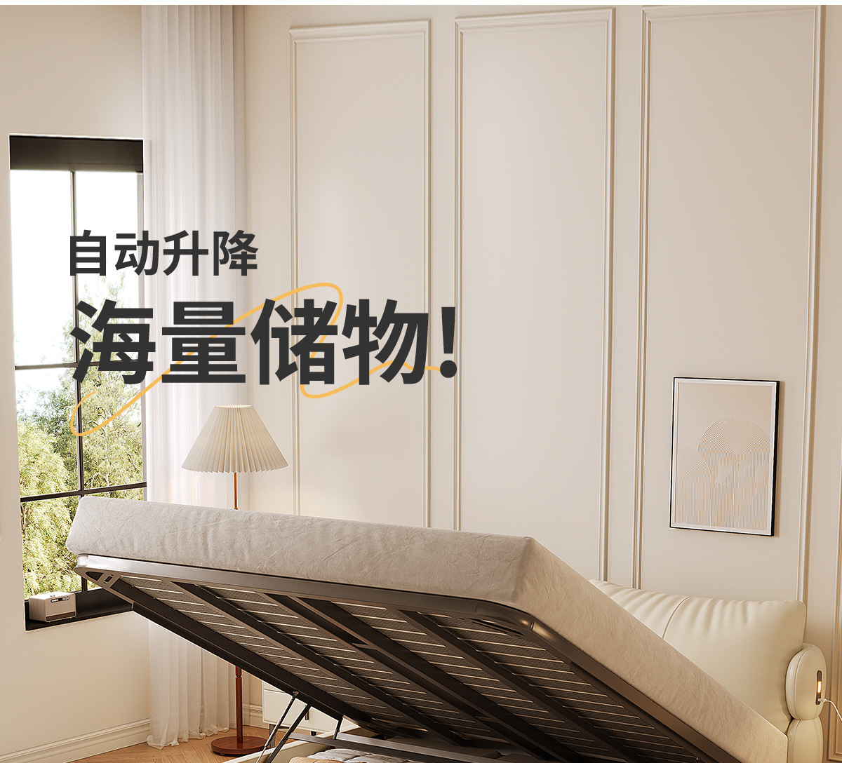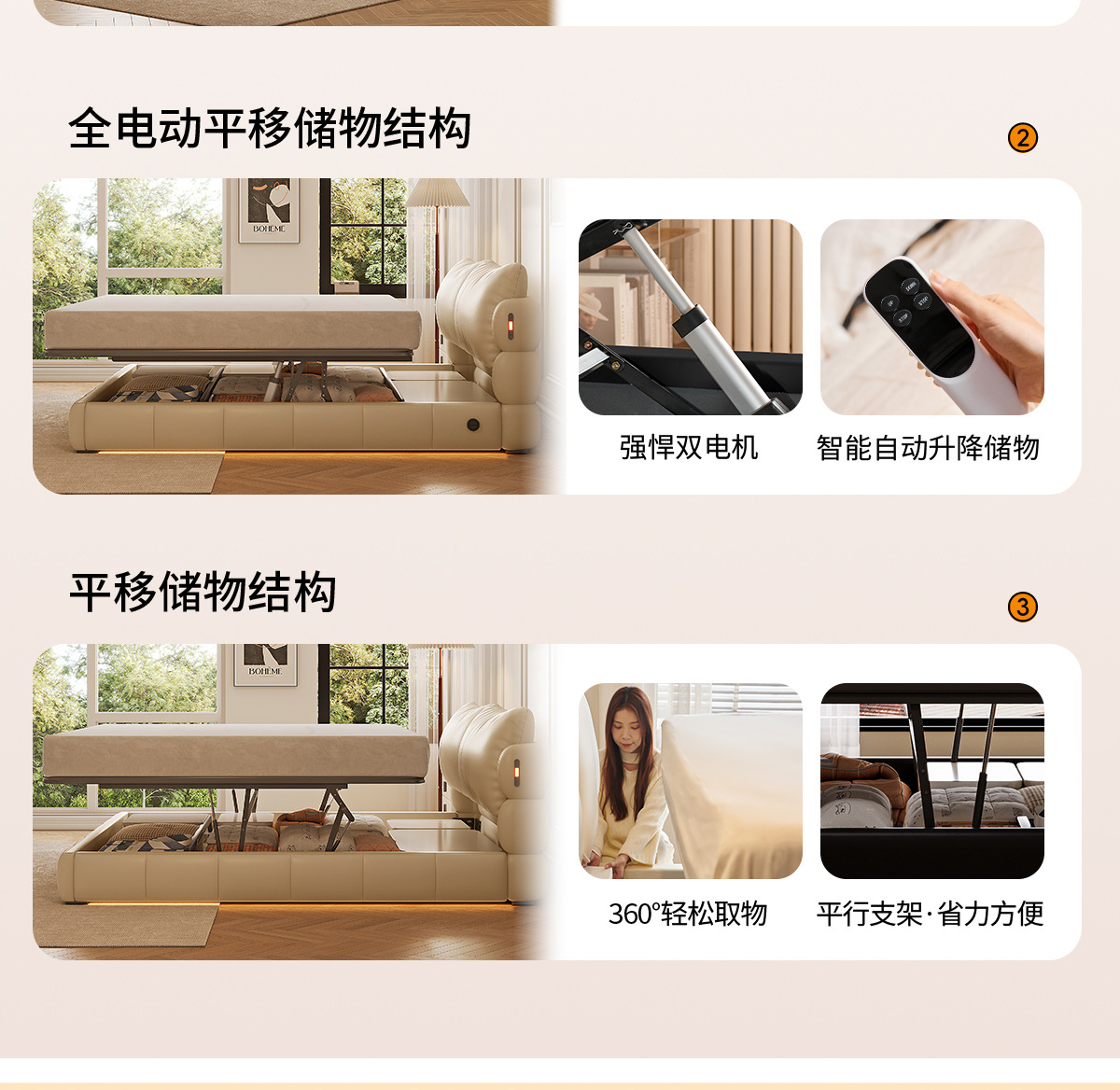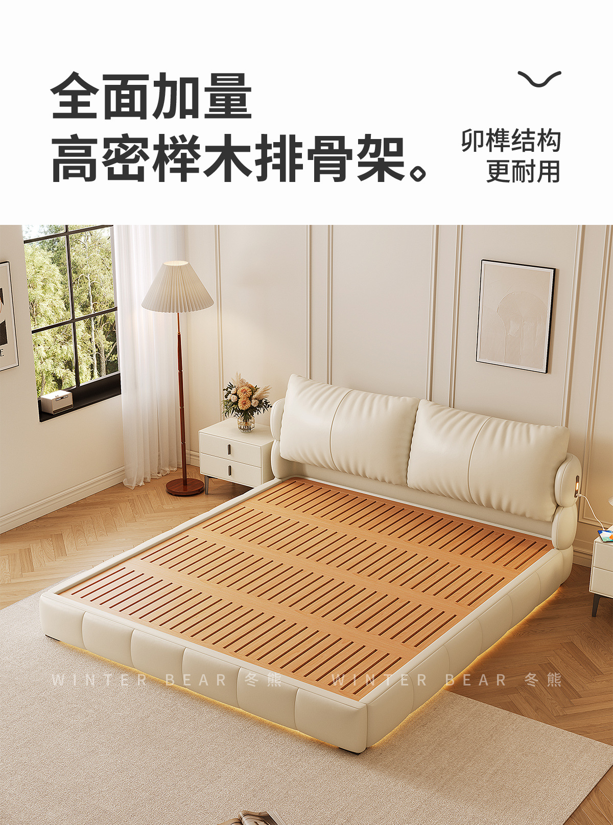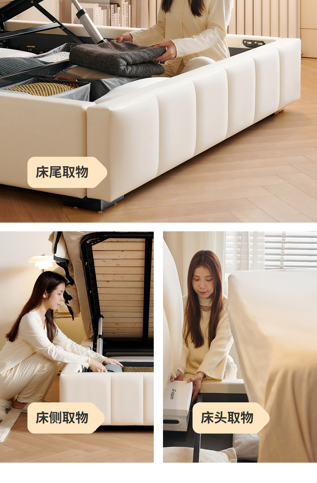 Двуспальная кровать с мягким изголовьем в стиле французского кремового цвета, с ящиками для хранения, электрическим механизмом подъема и обивкой из искусственной кожи «Зимний медведь».