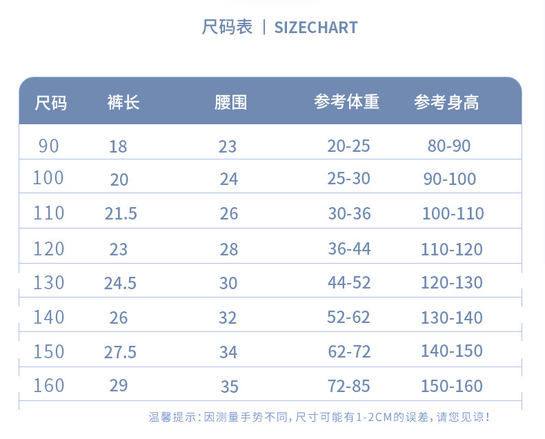 90cm; 100cm; 110cm; 120cm; 130cm; 140cm; 150cm; 160cm