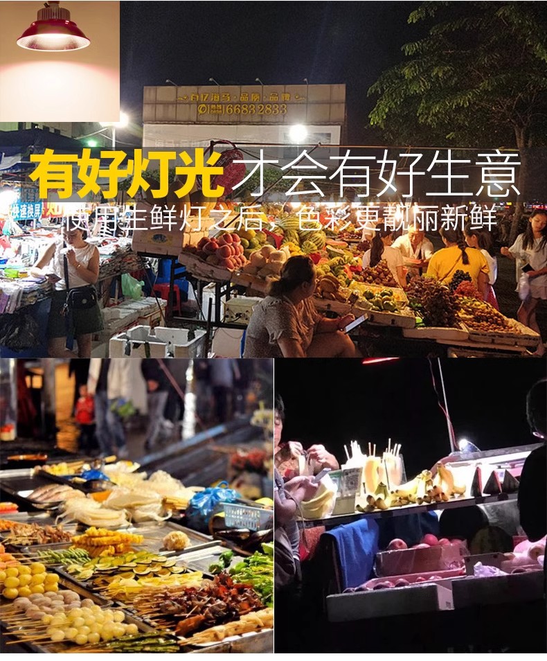 LED水果灯使用:灯的主体发光颜色为白色偏红。调节旋钮的大小控制灯泡发出的红色光线深浅。由客户自行调节,直至水果表面颜色看起来满意为止,使水果看起来色泽新鲜。从而提高自己水果的竞争力,提高销量,生意更好。
