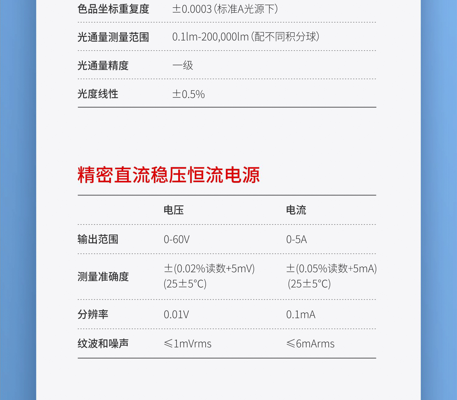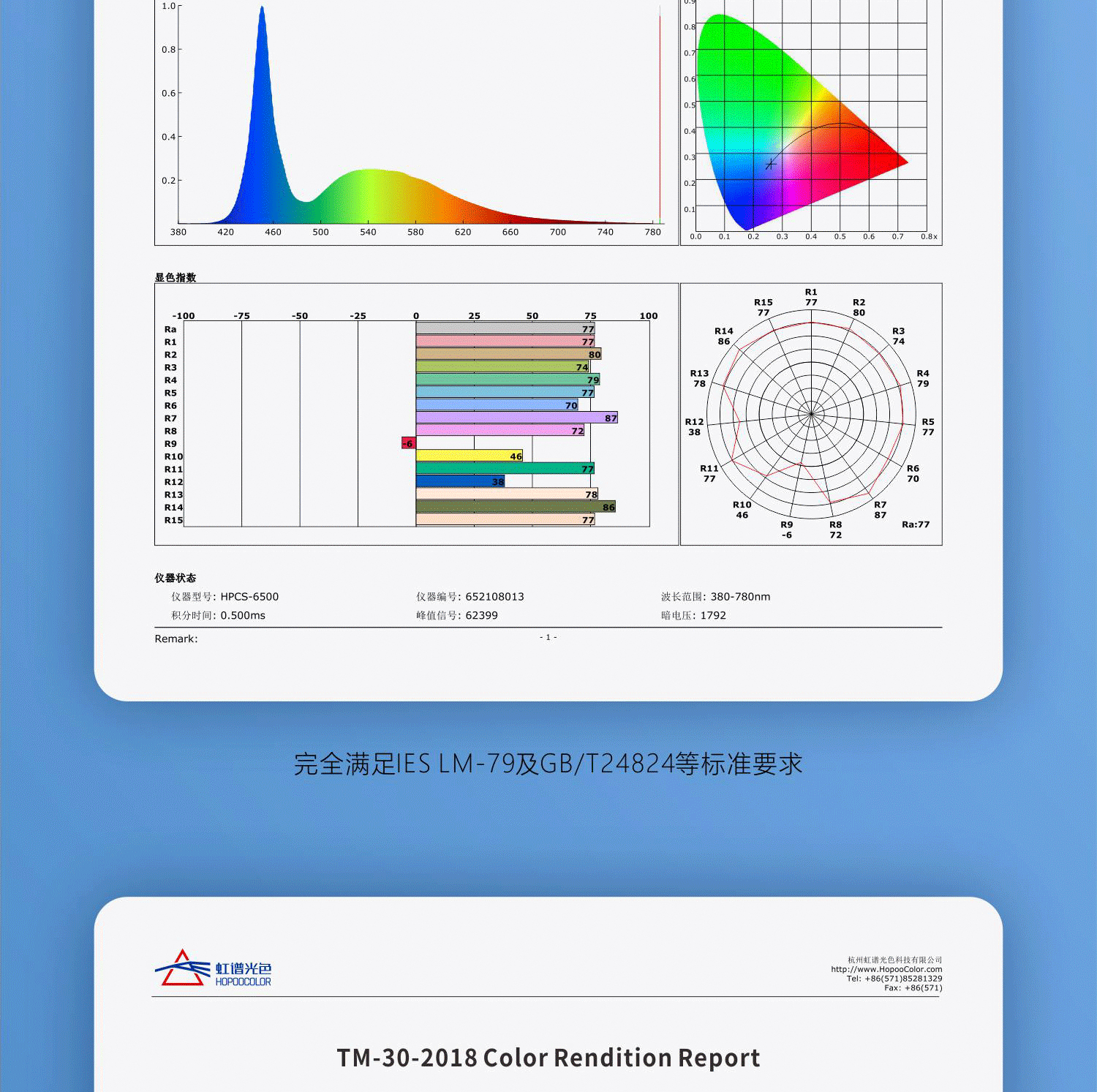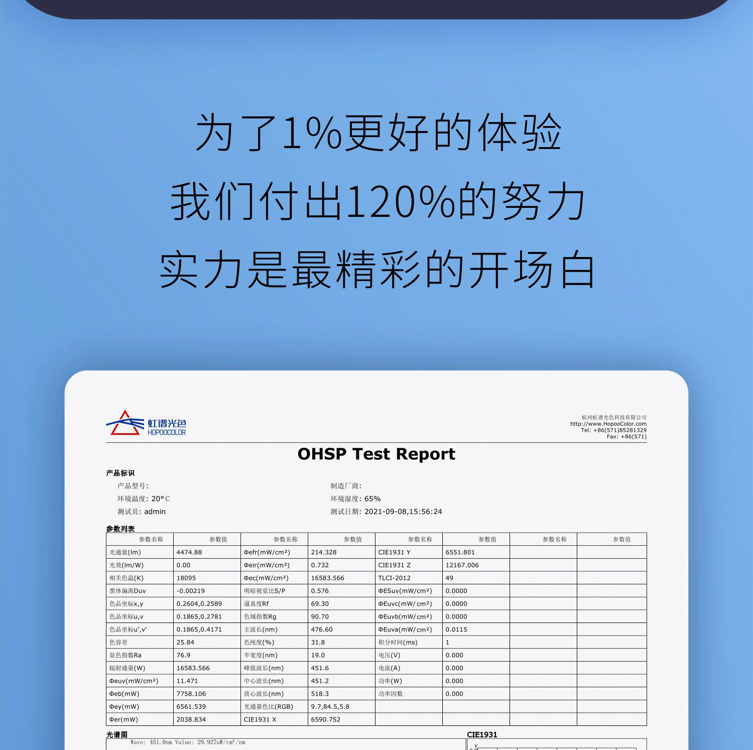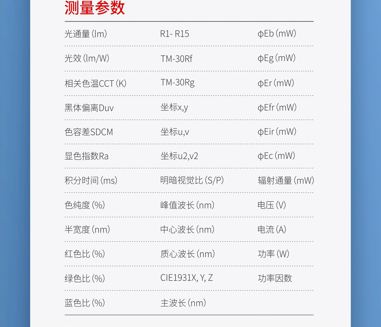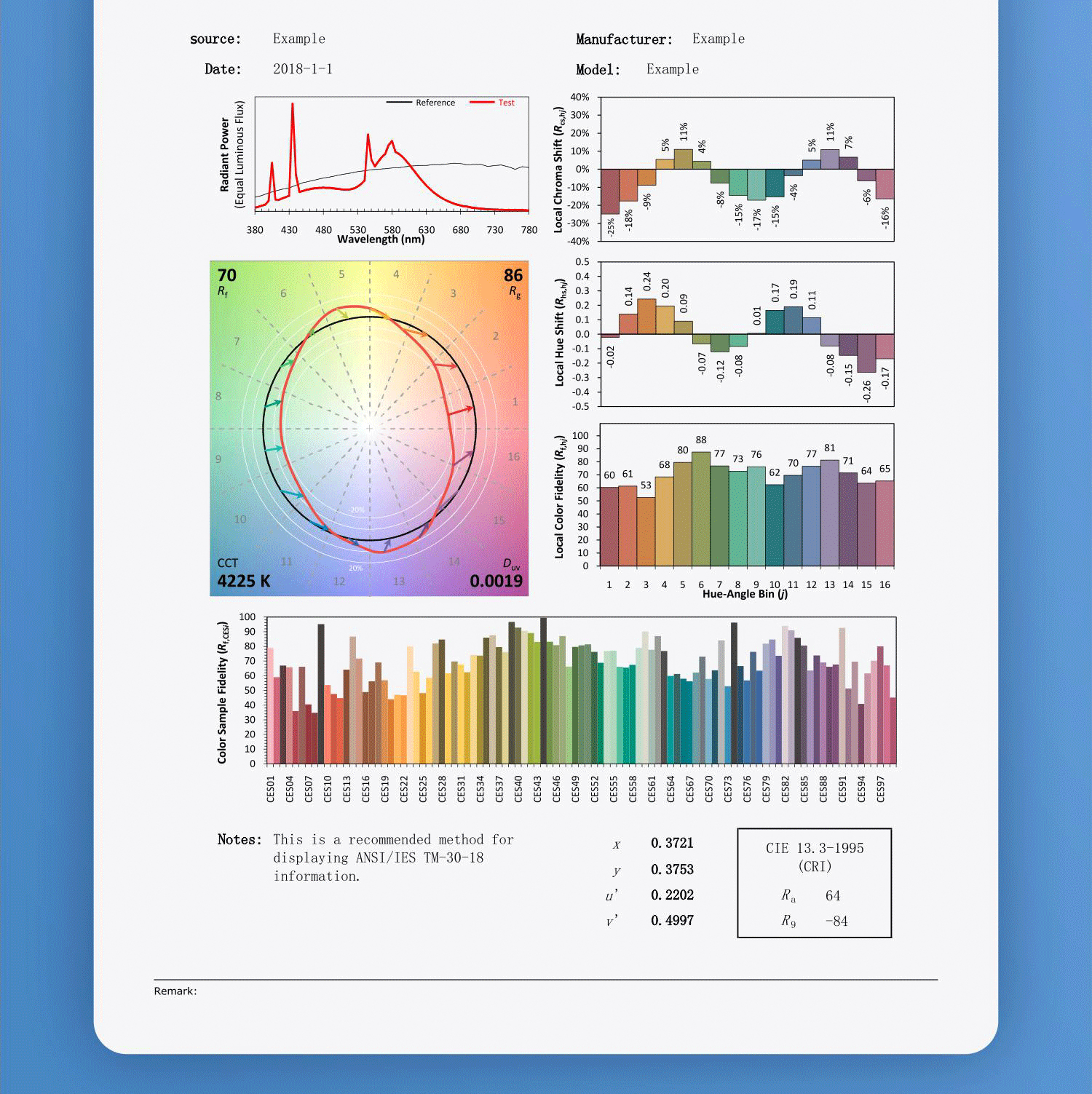 Цветовая температура спектра лампы, очевидный индекс цветопередачи, видимость стробоскопического эффекта, индекс мерцания и обнаружение других параметров.