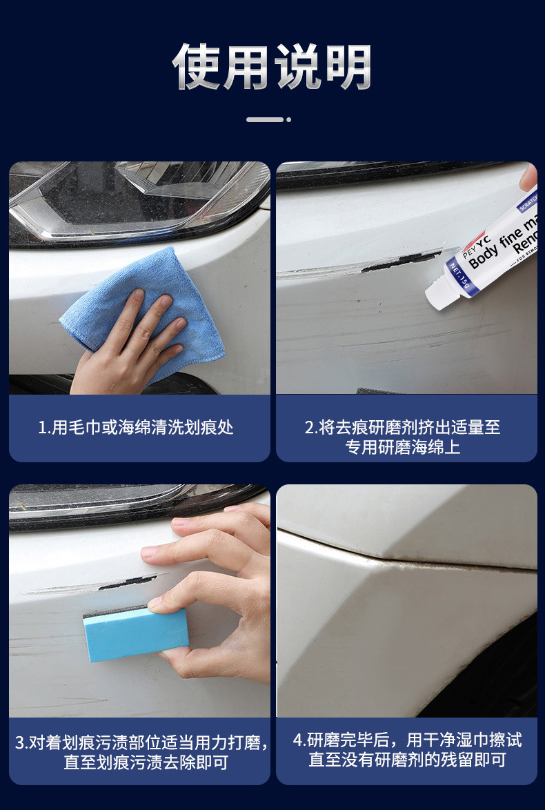 【注意事项】:本产品只对补漆后的砂纸打磨过的小擦痕、树枝刮痕、及车身一般污渍才有效果,对伤及底漆了是没有效果的。