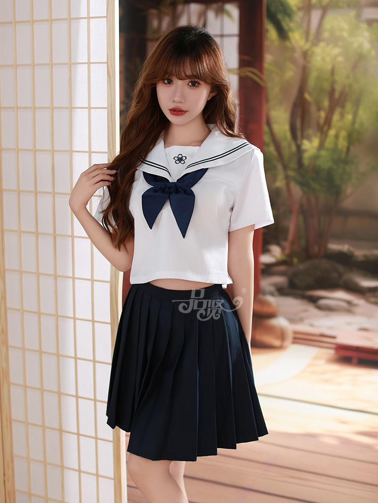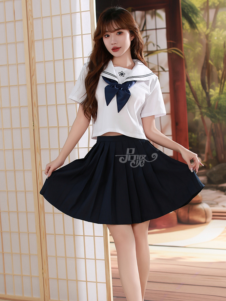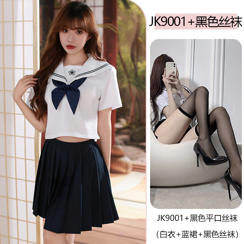 Белое синее платье; Белый топ + синяя юбка + белые чулки с плоским верхом; Белый пиджак + синяя юбка + черные плоские чулки