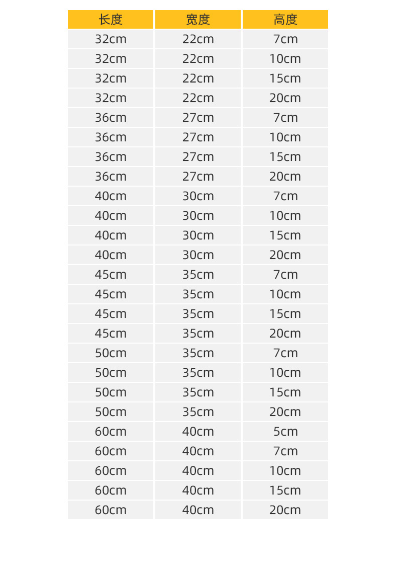 32*22; 36*27; 40*30; 45*35; 50*35; 60*40