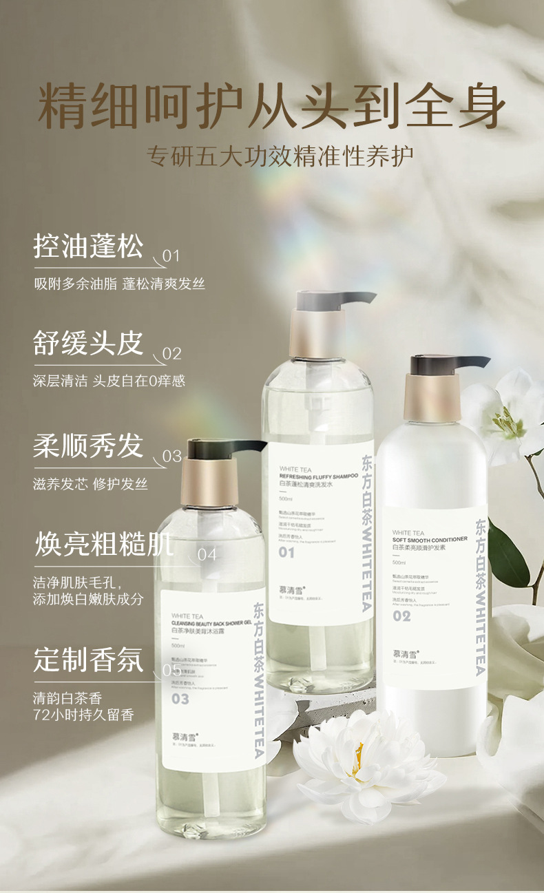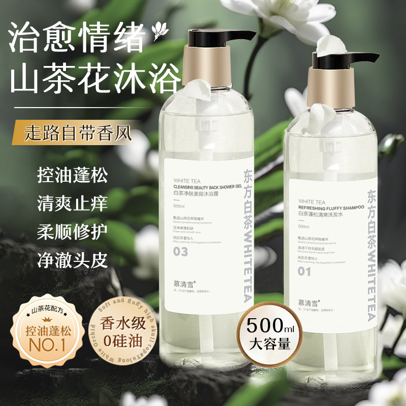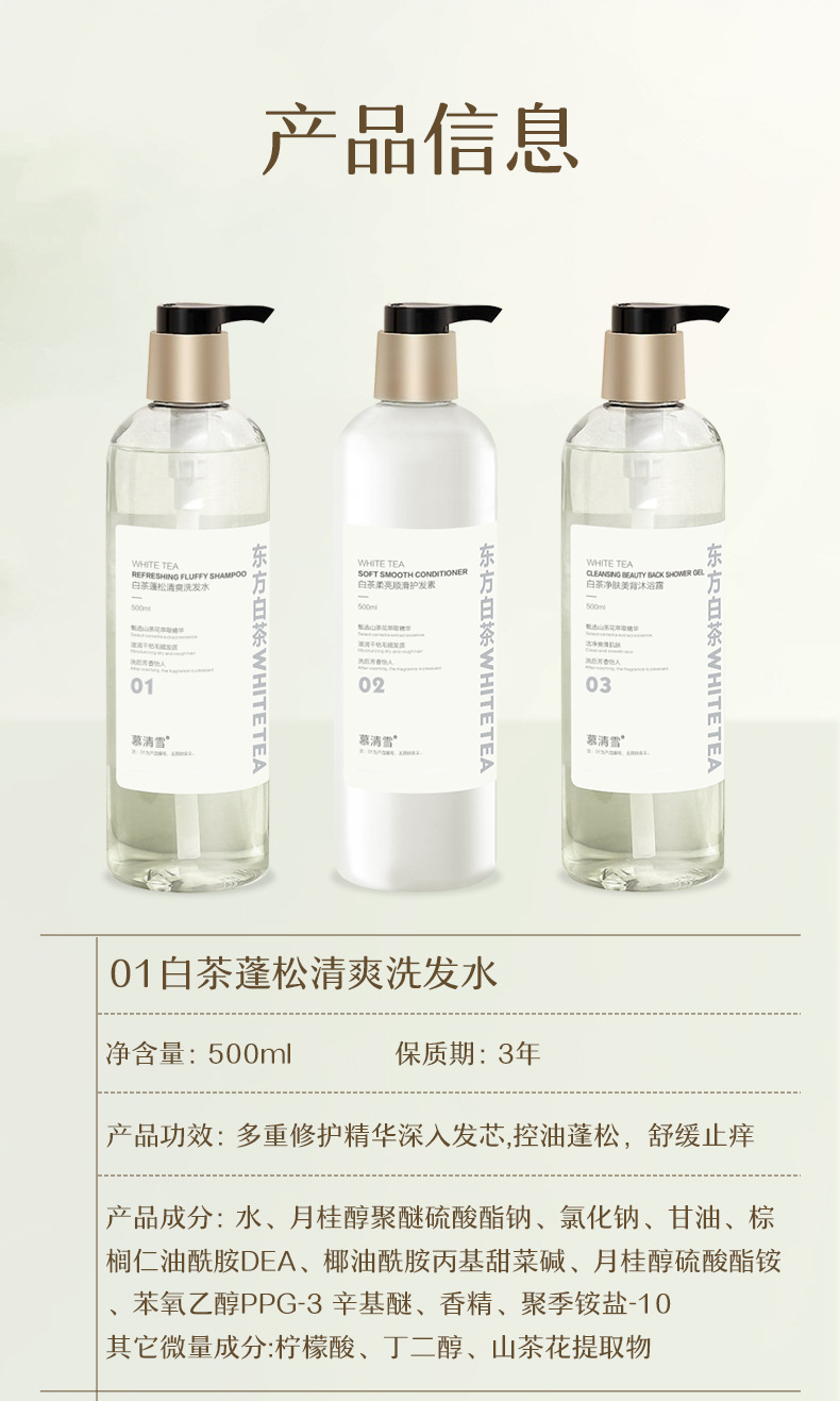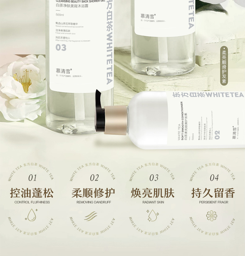 Му Цинсюэ белый чай пушистый освежающий шампунь 500ML; Mu Qingxue White Tea для очищения кожи лосьон для душа 500ML; Му Цинсюэ белый чай мягкий и гладкий кондиционер 500ML