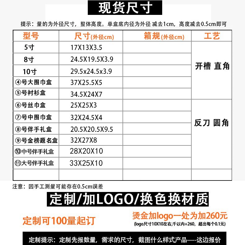 Оранжевый (средний размер без логотипа) шарф-бокс 32,5X24.5X4; Оранжевая (подходящая коробка для шарфа средней длины без логотипа) Сумка-саквояж; Оранжевая (без логотипа) квадратная коробка для шарфа 25X25X3; (Оранжевый квадратный шарф без логотипа) Сумка-саквояж 26,5X27.5X5; Черный (без логотипа) квадратный шарф-бокс 25X25X3; Черная (квадратная коробка для шарфа без логотипа) сумочка 26,5X27.5X5; 10 листов подходящей бумаги с серной кислотой в средней коробке.