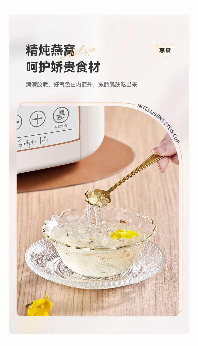3、隔水柔炖,呵护矜贵补品,营养充分保留,汤水清亮浓郁,食物纤维不会析入汤水
