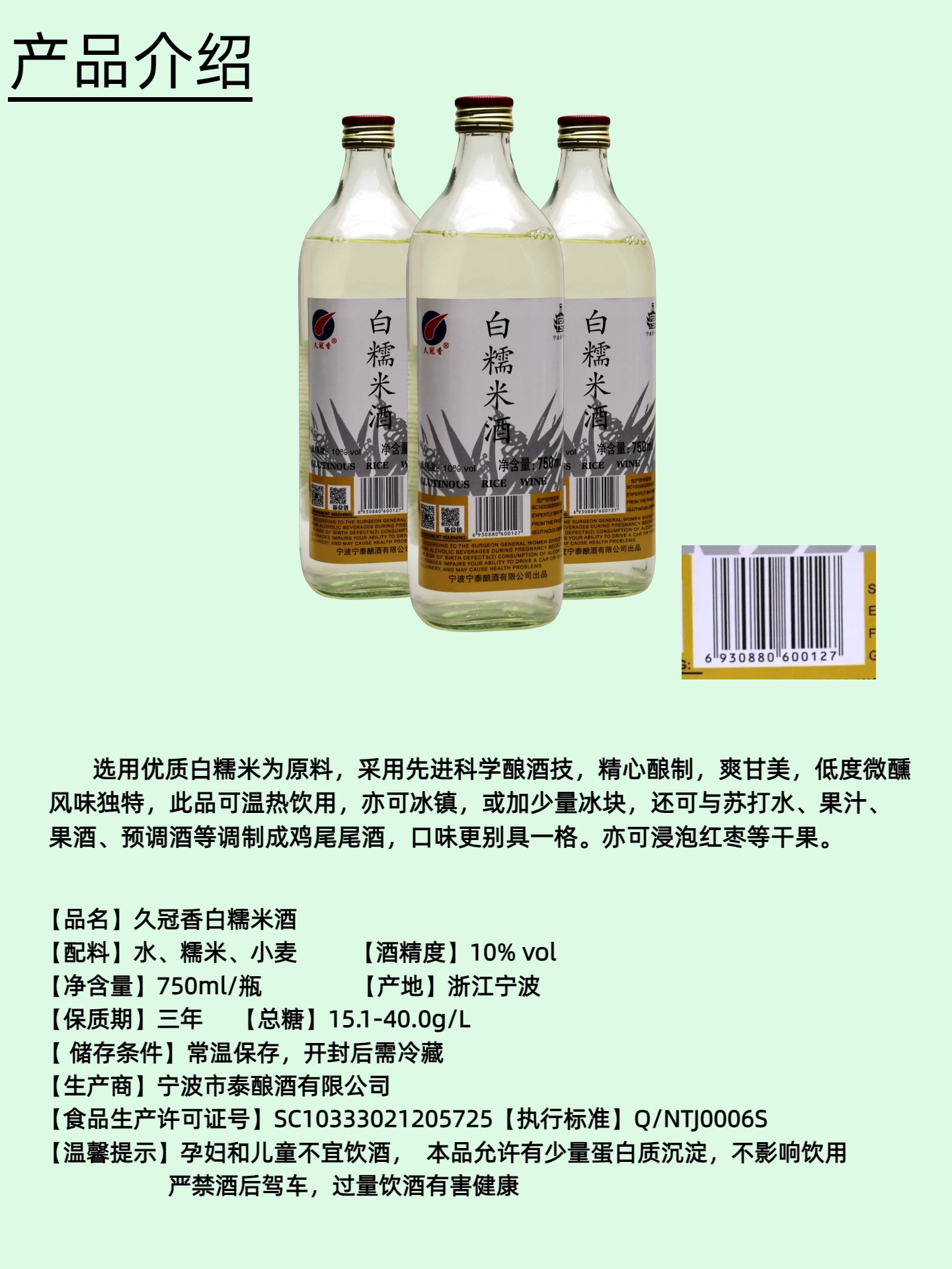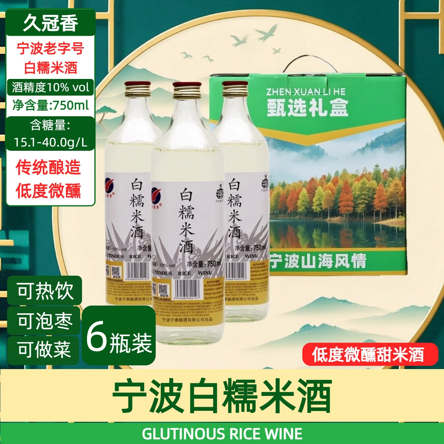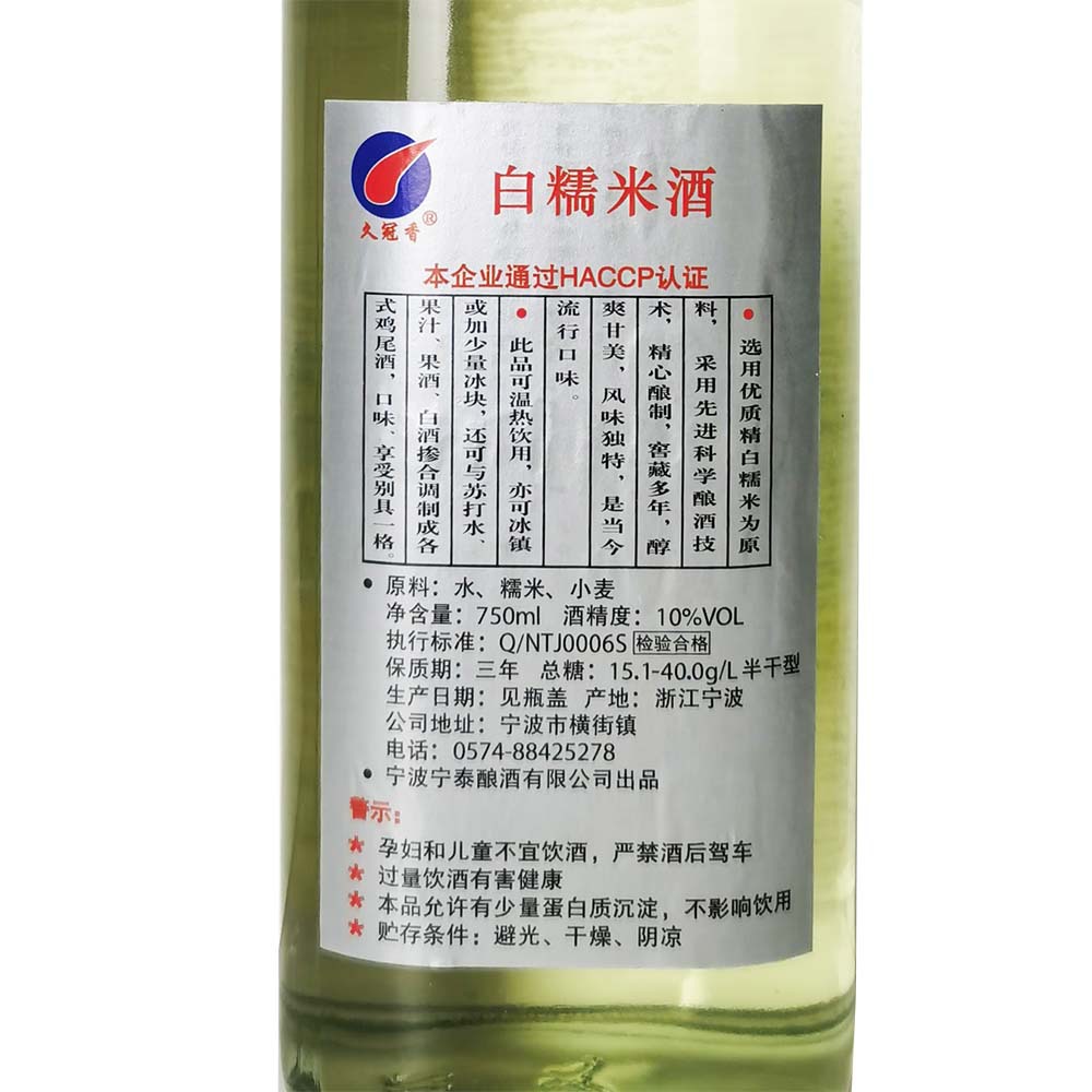 Ningbo Специальное белое клейкое рисовое вино из чистого зерна, вареное низкокачественное рисовое вино 750mlX1 бутылка стеклянная бутылка с низким содержанием рисового вина