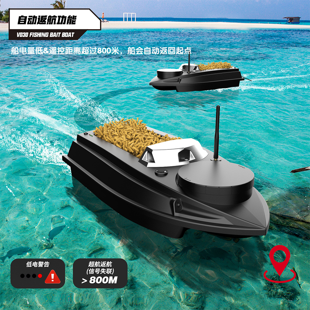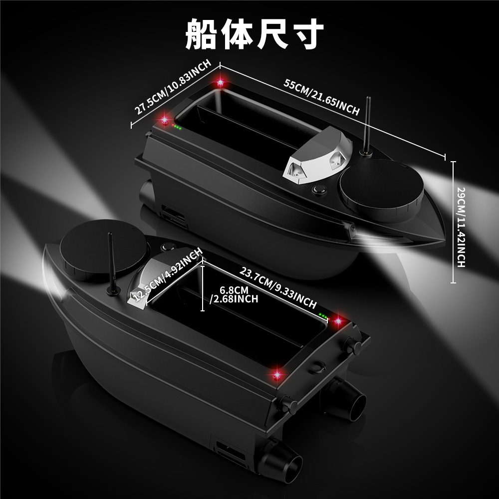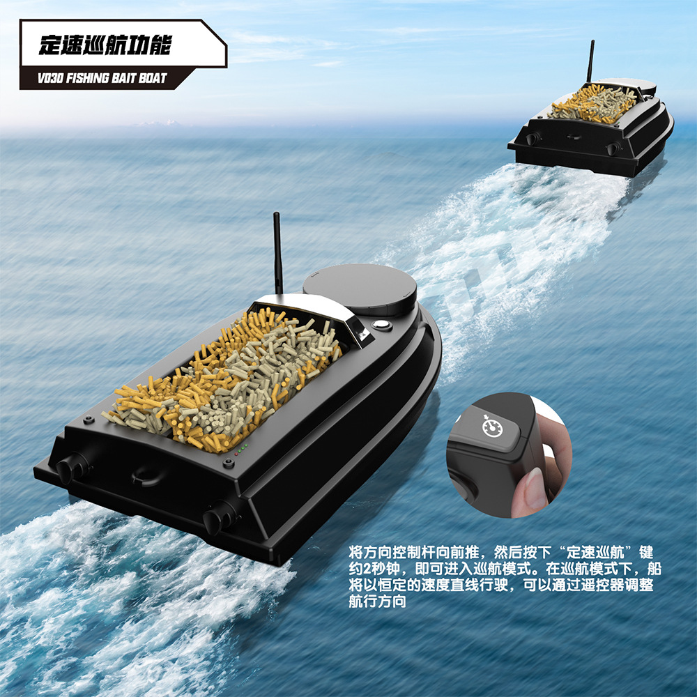 功能描述: 800M遥控距离 / 12V供电系统,高速行驶/双驱动系统,2档速度切换 / 水冷保护系统/船头双高亮夜航灯、两种灯光模式 / 船尾转向提示灯 / 单仓/双仓自由切换,3kg载重 / 低电提醒 / 定速巡航 / 定位点间巡航 / 偏航自动修正 / 一键返航/低电返航/失联返航/超航返回 / 电子围栏保护 / 可设置9个钓场,180个钓点 / 一键脱钩放网 / 4.3英寸高清大屏遥控器 / 可选配快拆式声呐连接杆