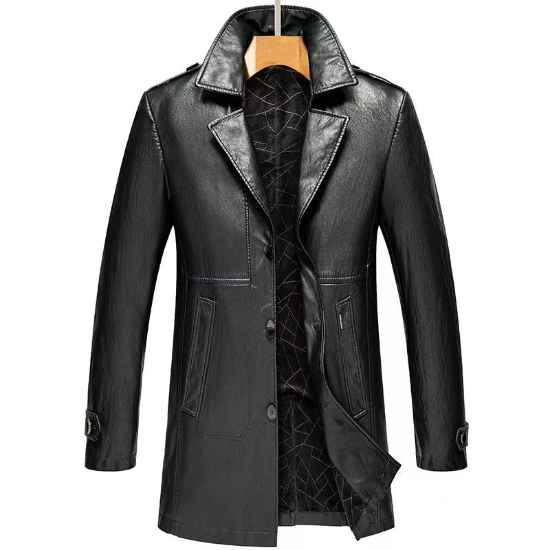 Мужская средняя длинная деловая повседневная кожаная ветровка с бархатом осенью и зимой теплая кожаная куртка с воротником пальто