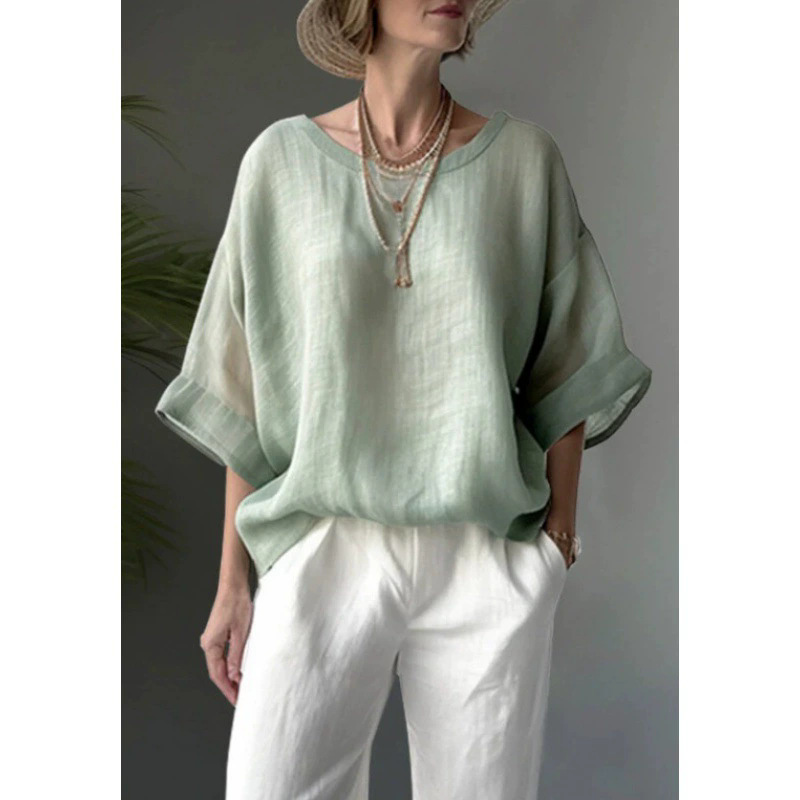 Большое количество готовых трансграничных новых продуктов, однотонная удобная повседневная рубашка с круглым вырезом и открытыми плечами, свободная женская рубашка большого размера для похудения
