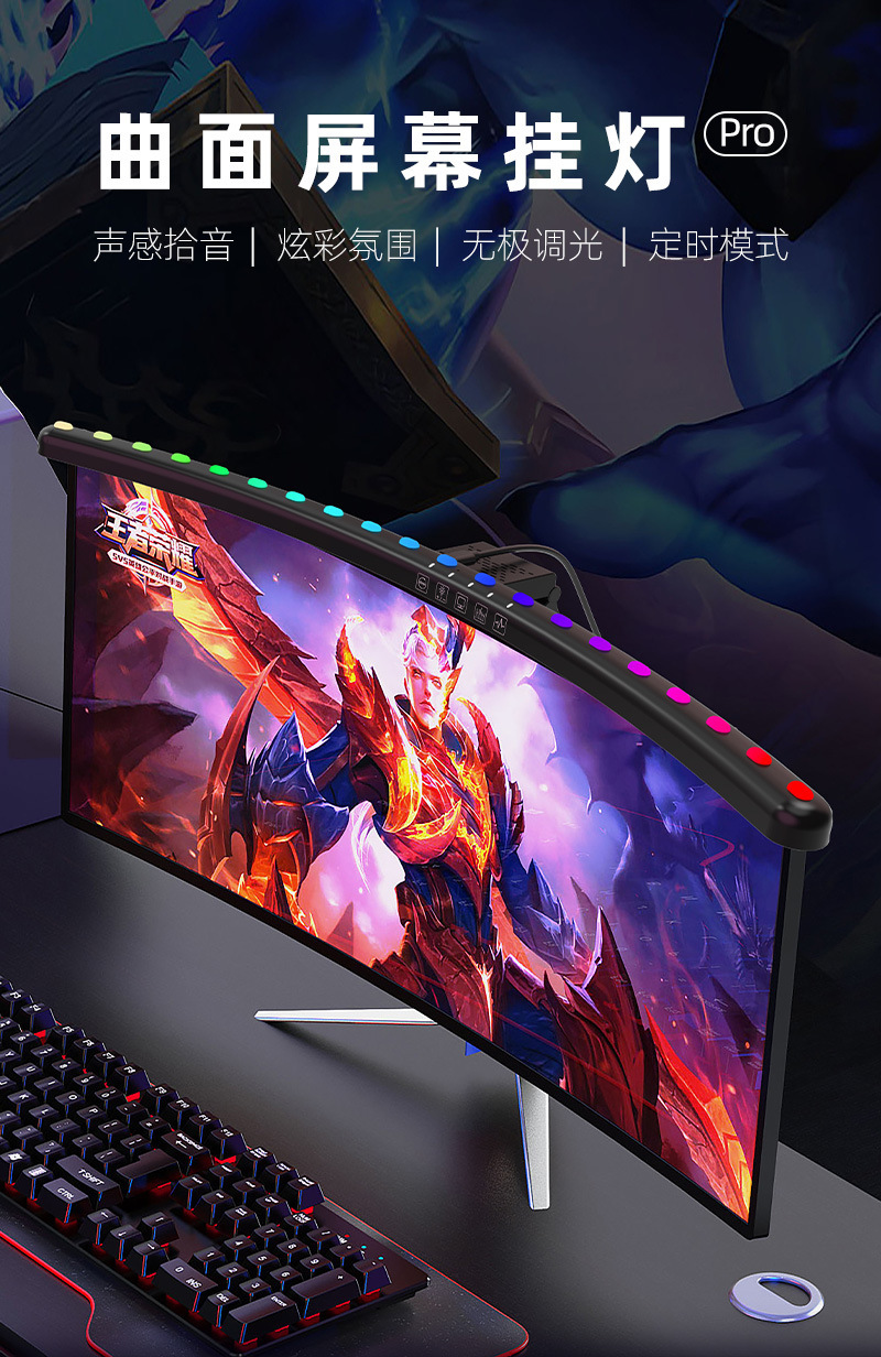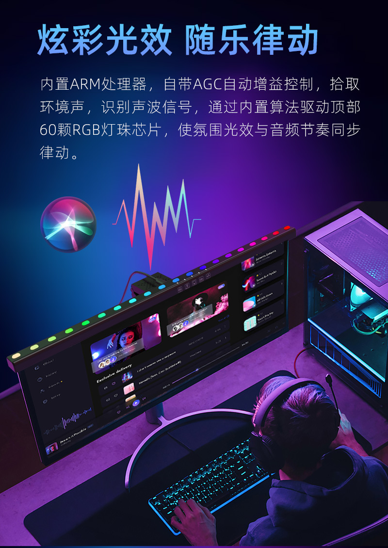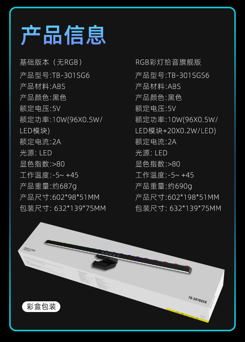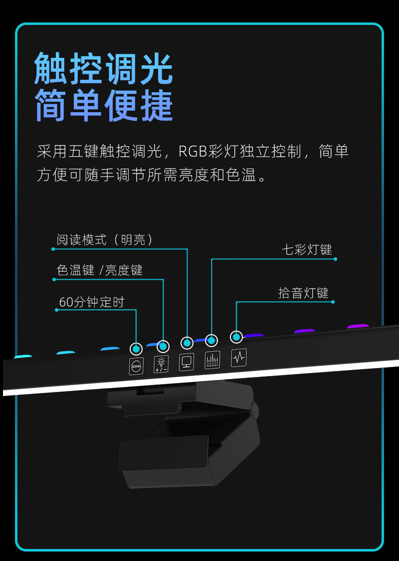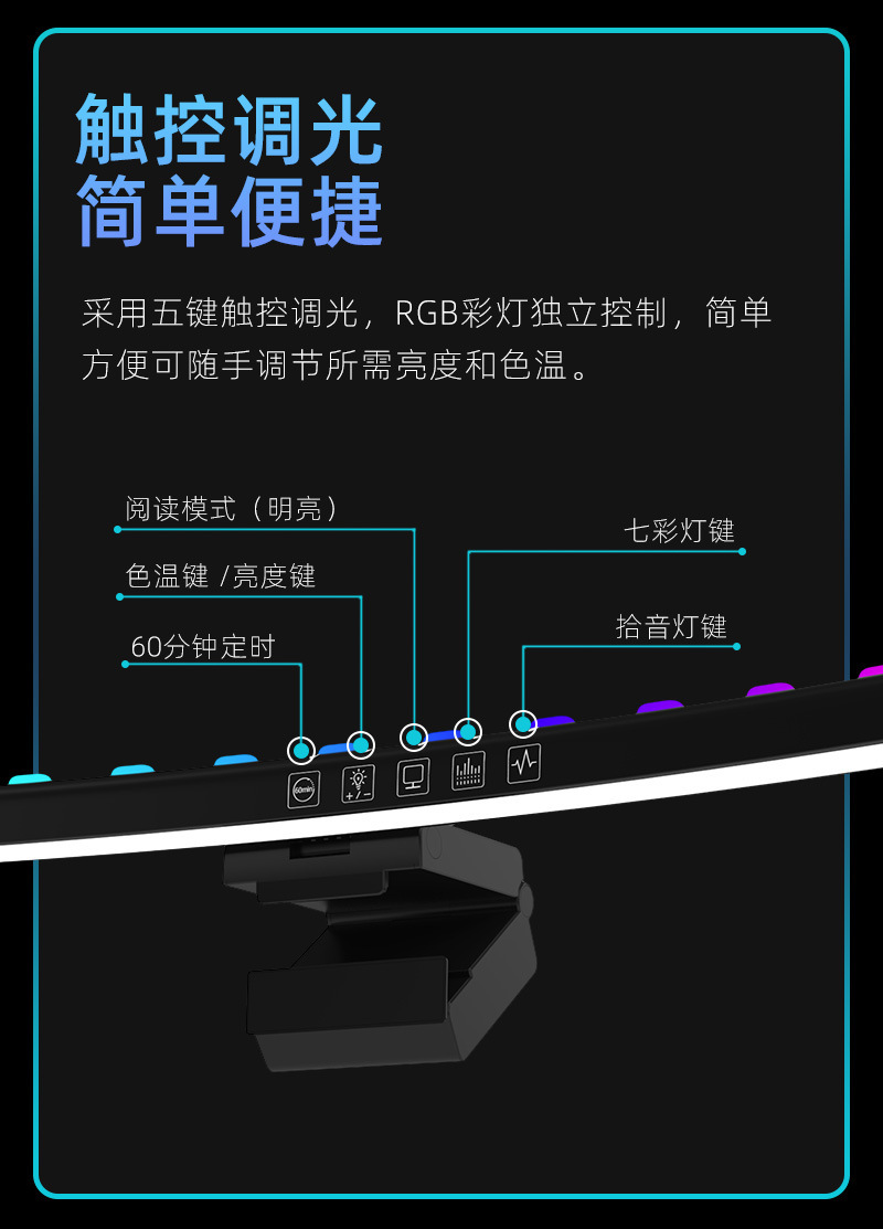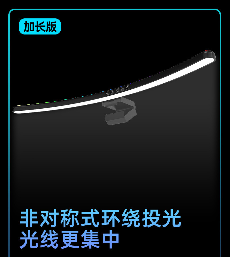 功能特点:定时60分钟关灯功能,无极调光,快捷阅读模式,三色温调节,挂屏幕厚度1CM-5CM厚度内;七彩氛围灯光可以选择和跑马形式,带拾音RGB背光律动功能,